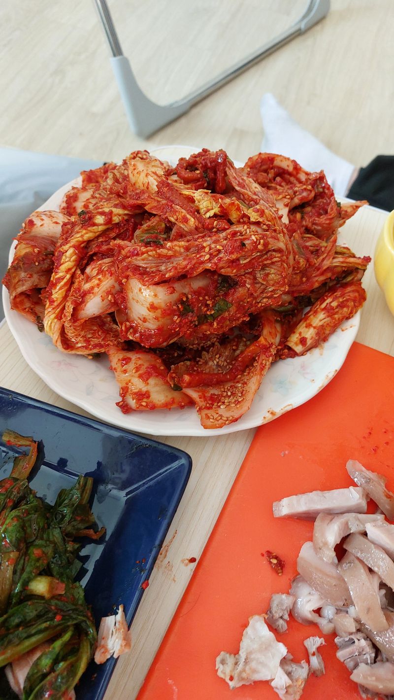 점심때 잠깐 수육하고 담은 김치랑 밥2공기 먹었어요.