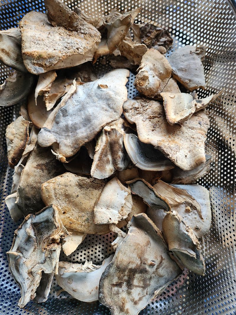 뽕나무 느타리버섯으로 보이는데 너무늦게 채취해서 품질이 좋지않네요 어릴때 초기에는 하얀색에 쫄깃쫄깃 탄력이 있구요 요리하면 맛도 일품입니다 뽕나무 오디 뿌리 가지가 당뇨에 좋듯이 뽕나무에서 자란 버섯도 당뇨에 좋다고 합니다