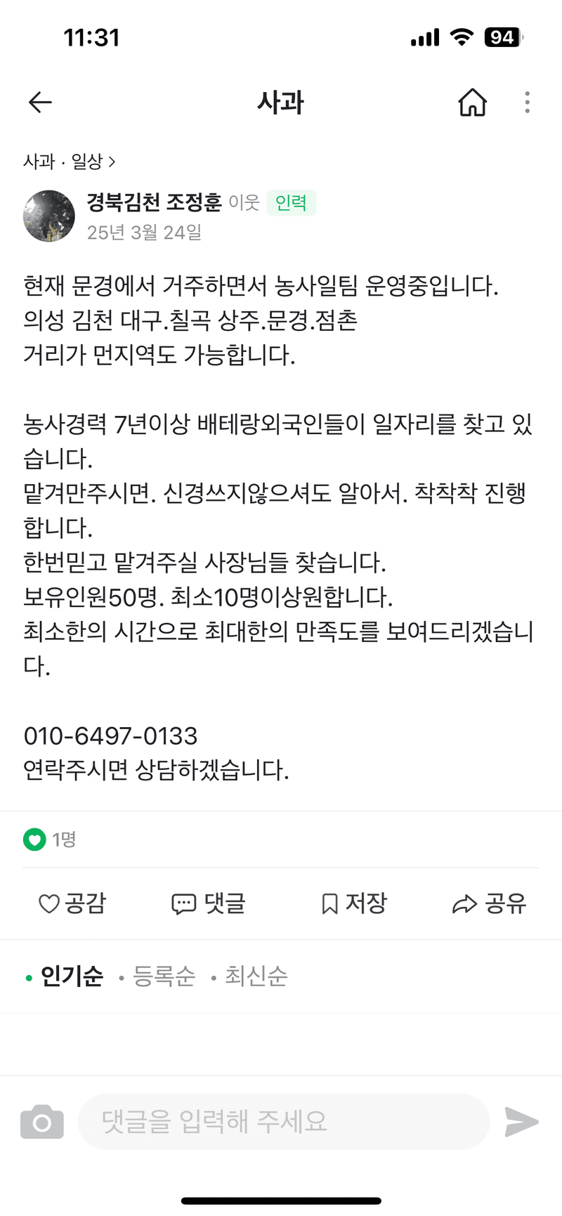 팜모닝에 글 올리시는 인력 사장님한테 한번 연락해보세요