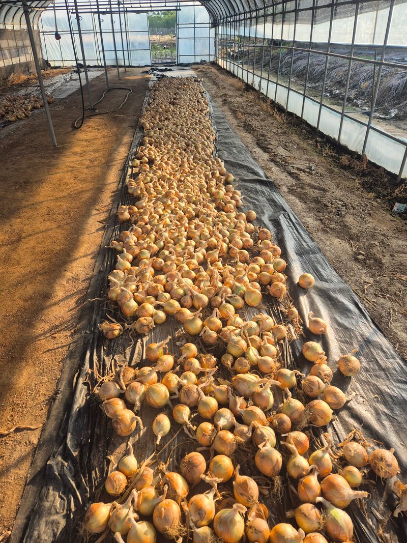 하우스에70% 정도되는 차광막치고30~40일 정도 바닥에깔아 말린 다음 저온창고 한쪽에 저장 하면됩니다