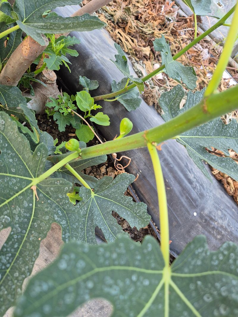 노지재배는 무화과가 늦게 달리므로 서리올때까지 익는게 어느정도 한계가 있어 대략 15잎 선에서 적심해야 달린 열매를 모두 수확할수 있읍니다 자라고 있는 가지를 약간 뉘우고 볕이 잘들어야 열매가 맺히니 참고하세요