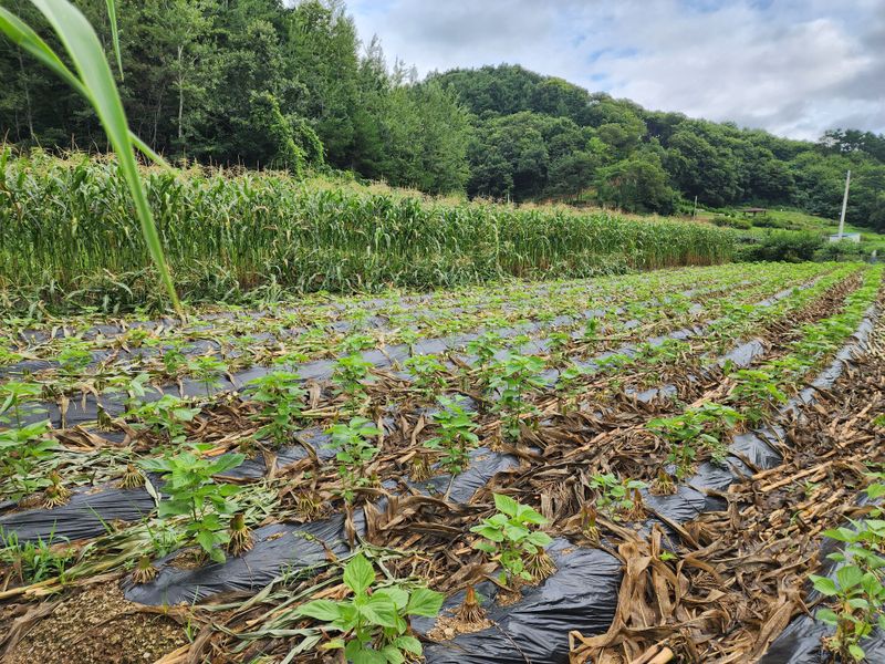 흙찰 옥수수 300평 심어 한통에600원씩 출라하고 옥수수 대작업하고 들깨 모종심었어요