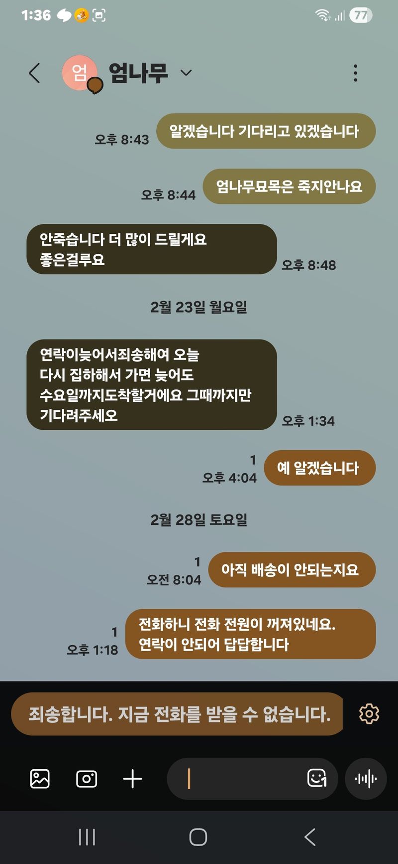 1월 30일부터 구매한다고 해서 돈입금했는데 2월말 현재까지 물건을 못 받았어요 현재는 휴대폰 전원까지 꺼놓은 상태로 연락두절입니다