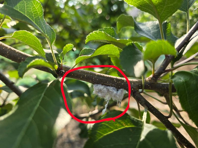 지금 시기에 사진에 보이는 흰 솜털로는 정확히 무슨 벌레인지 구별은 힘듭니다. 사과면충. 미국선녀벌레.갈색무늬매미충 이 세가지 곤충 중 하나입니다. 그리고 사진에 갈색무늬와 점무늬낙엽병도 많이 보입니다.장마기간에 비가 다시 많이 온다면 조기낙엽이 많이 발생할수 있기에 살균제와 살충제를 꼼꼼히 자주 살포 하셔야 할듯 합니다.