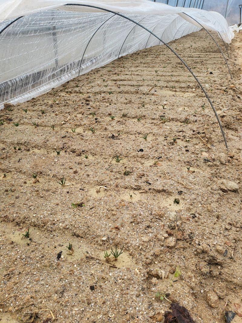 하우스에 심고 물주고 비닐터널 해주고 눈오는 하우스 안에서 2단 심었습니다