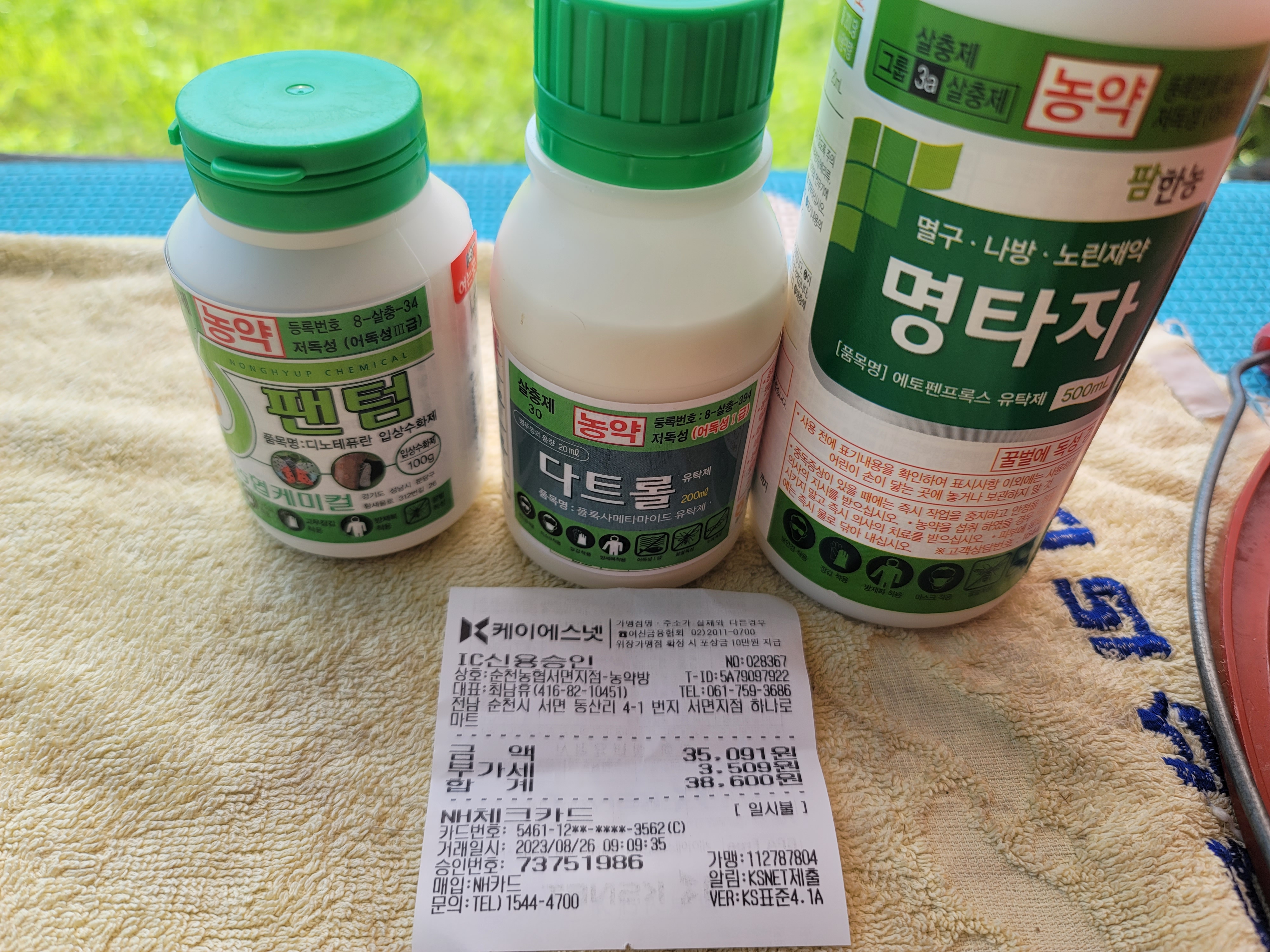농약살포(농협에서 노린재피해 방제 문자 보냄) 카브리오에이, 타스타, 팡파레에스 살포 6통물량