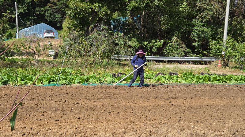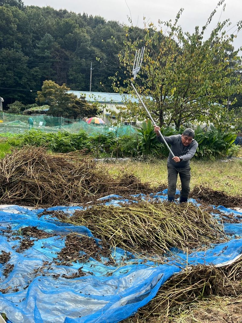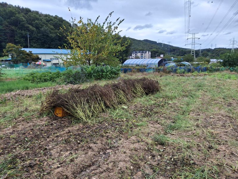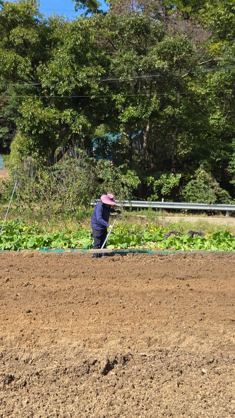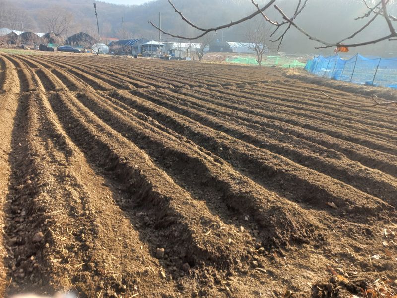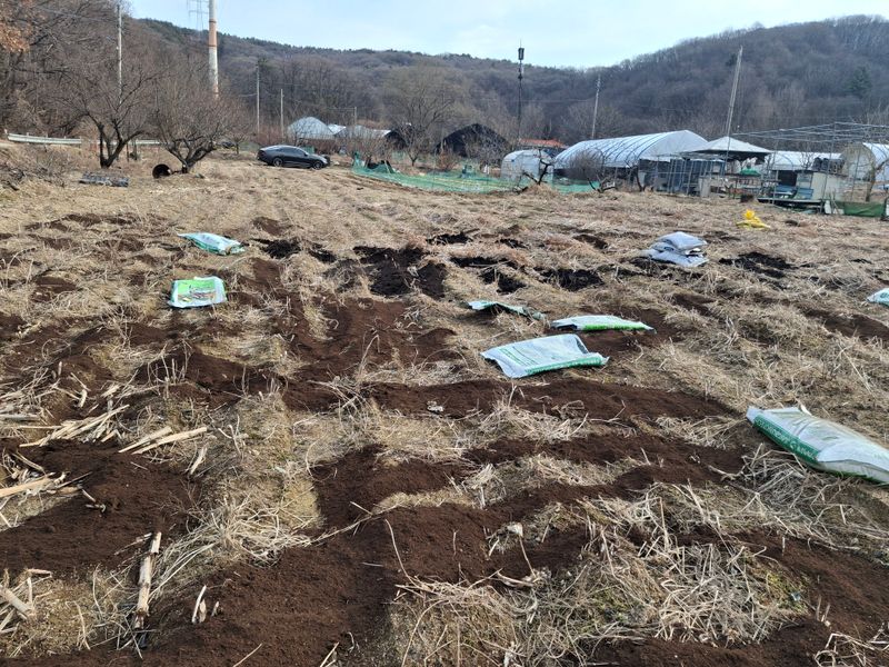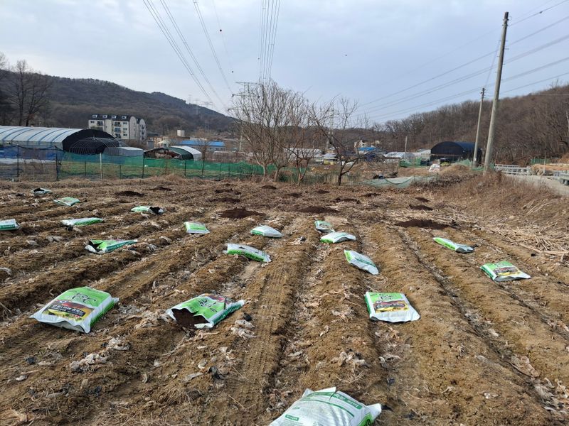 아래밭 400평 로타리 작업 퇴비 92포 뿌리다 20키로 4포 생석회 8포