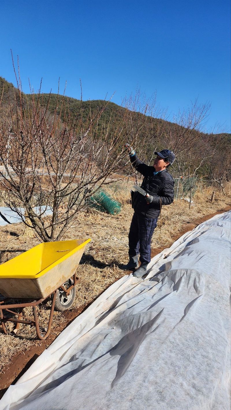윗밭 전체 멀칭비닐걷기 아랫밭 멀칭비닐걷기 개복숭아 전정작업 살구나무 전정작업 마늘 양파밭 부직포 걷어내기 요소비료 연커미비료구입 톱 12000원구입 지난번 31100원구입장부정리