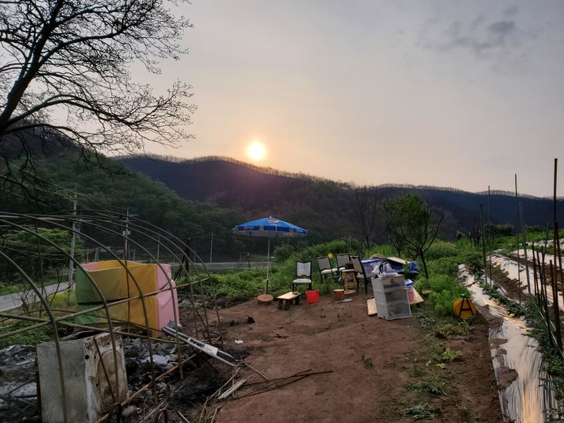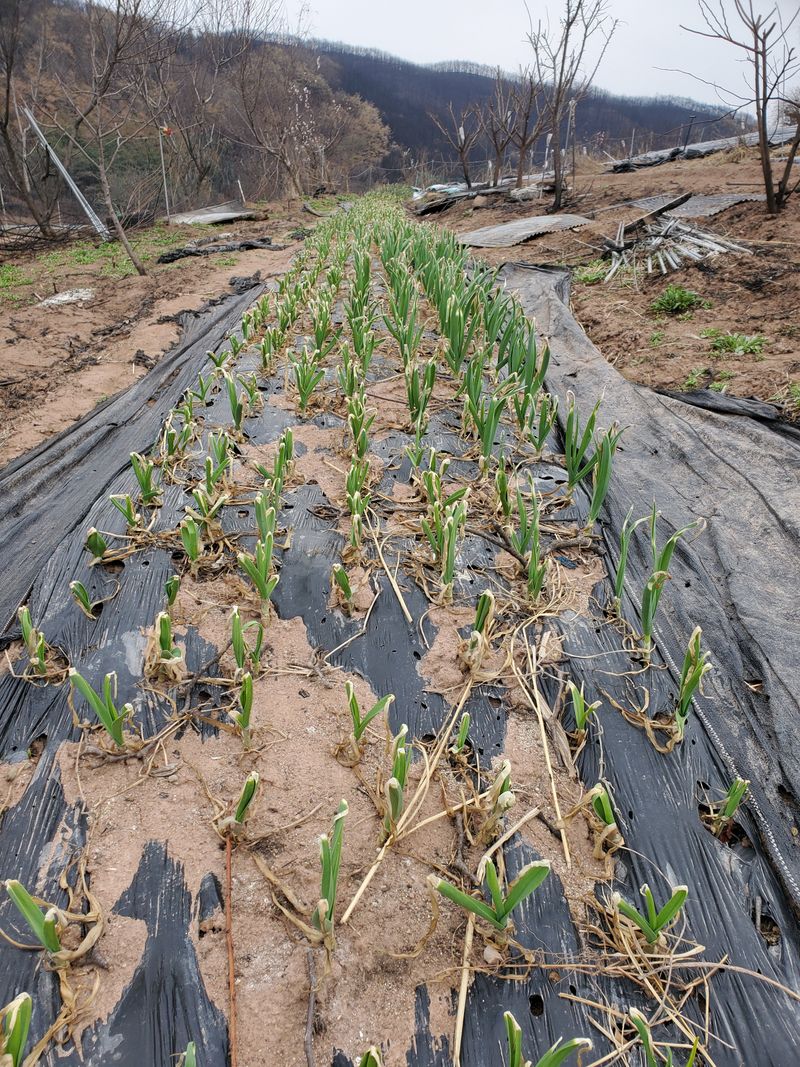 오늘 일직면사무소 방문 산불피해농가조사 확인 싸인 다타버려 농장장비 42만원구입후 상추등 모종구입 농장에 다탔지만 85포기 상추등 심고