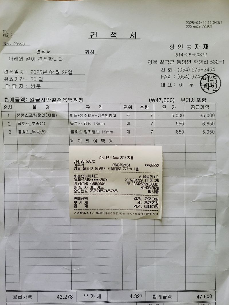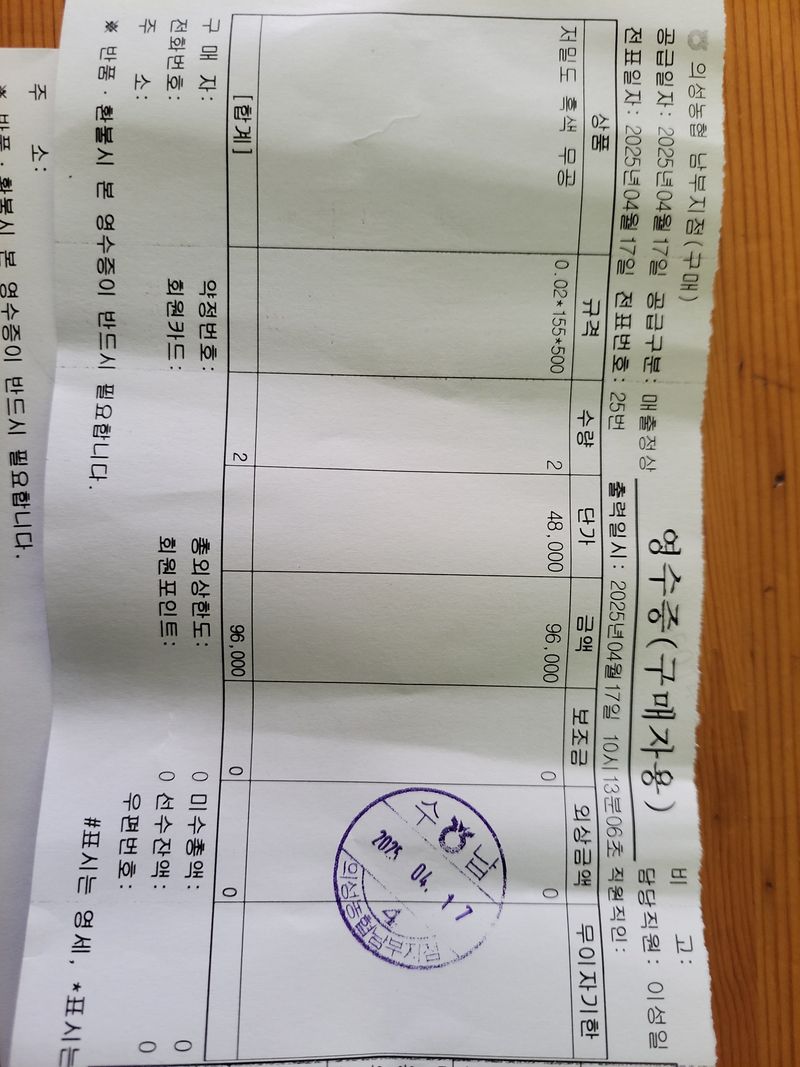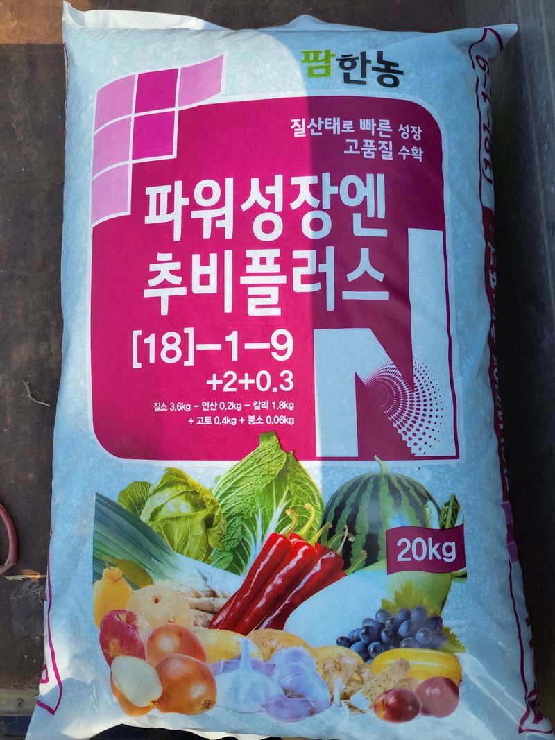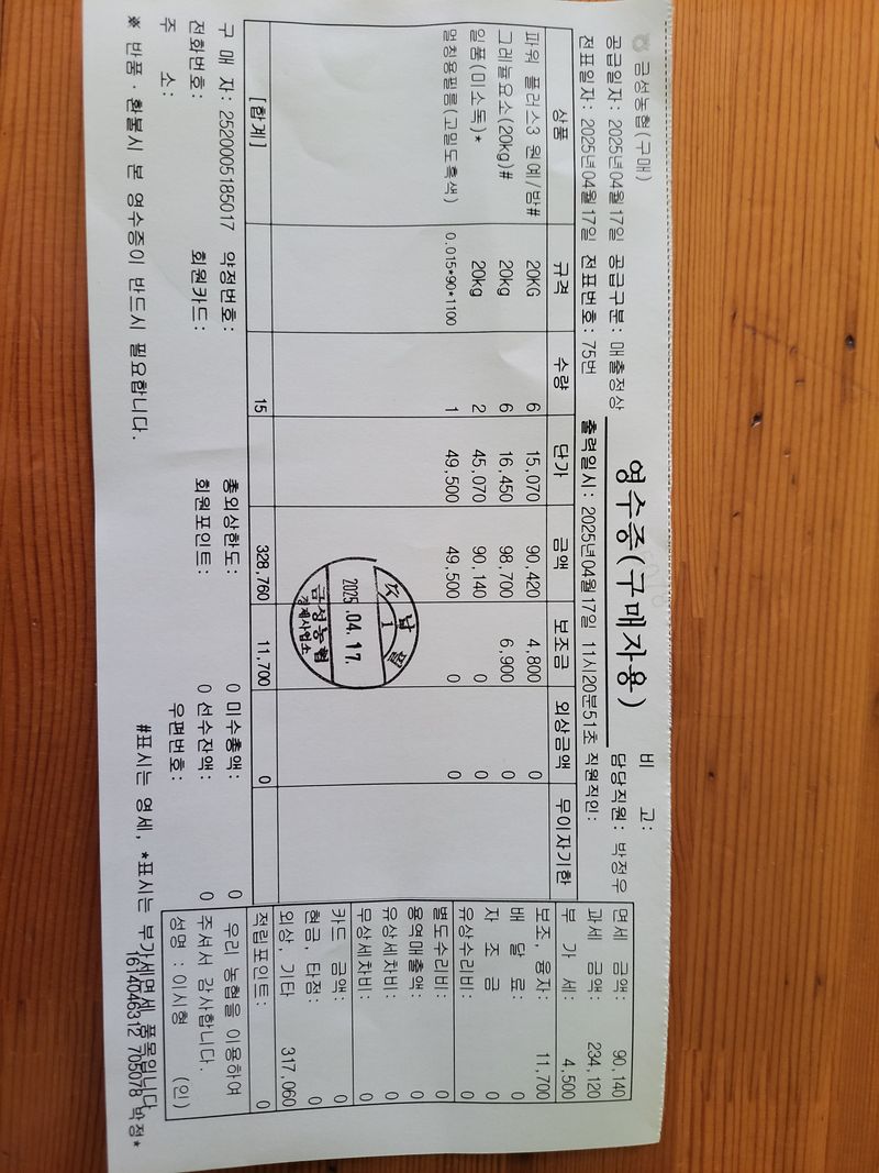 노지가지 비닐 0.02×155×500=2:96.000원 파워플러스3원예 20kG×6=90420원 그레놀요소 20KG×7=98.700원 0.015×90×1100m=49500원