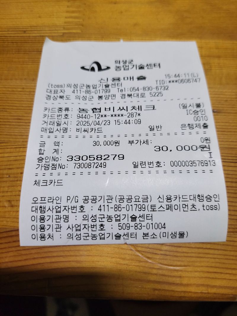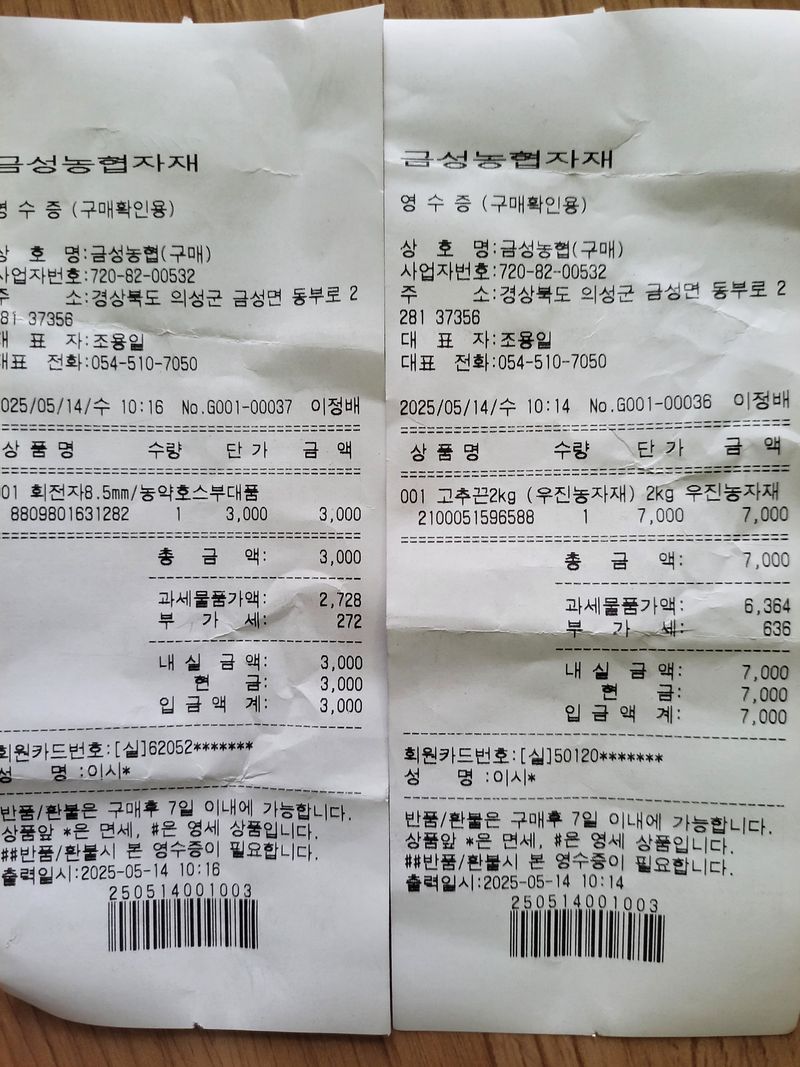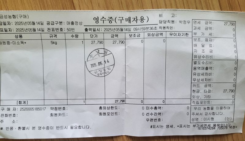 농자재구입 1)고추끈2k=7000원 2)회전자8.5=3000원 3)대원콩(미소독)=27790원 총=37790원현금지출