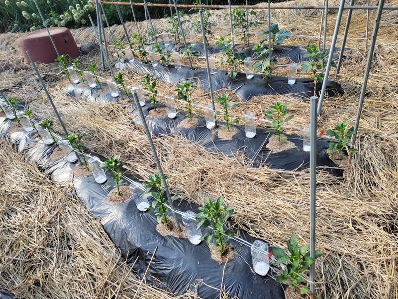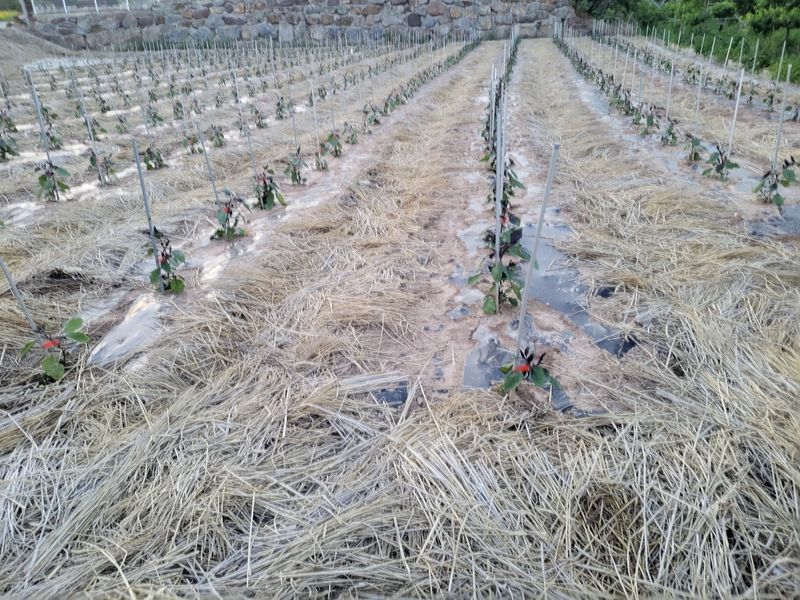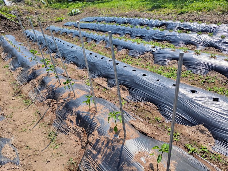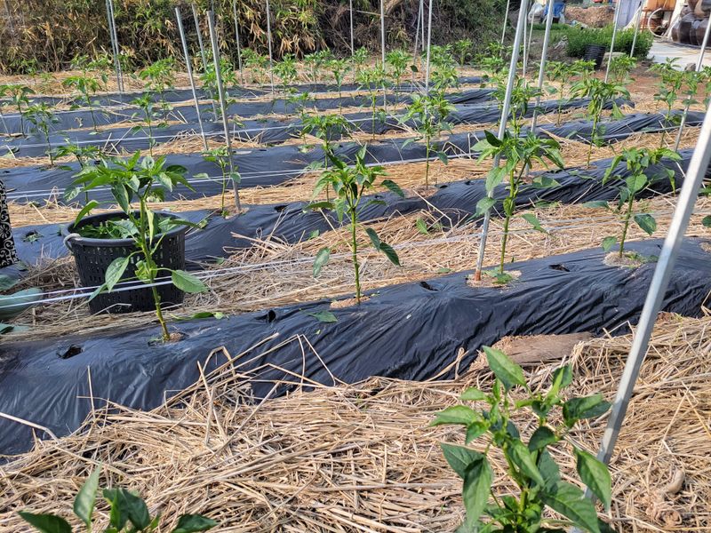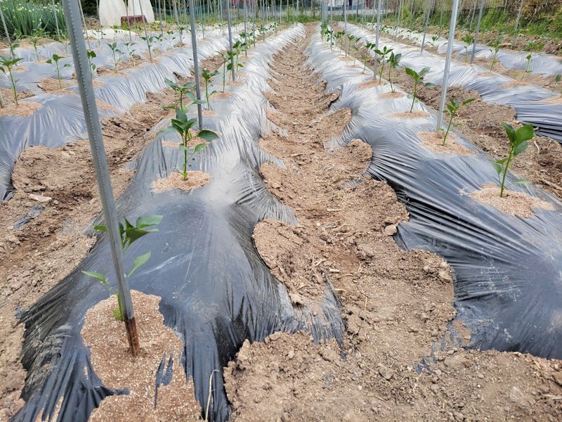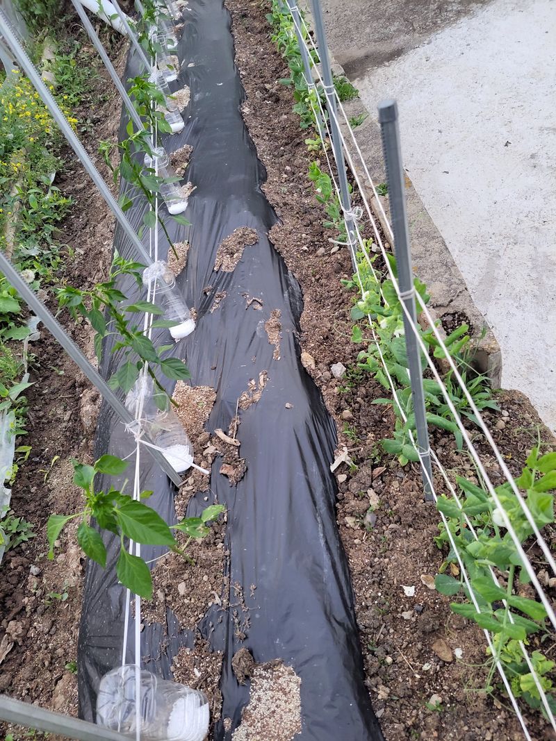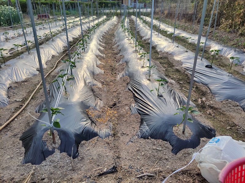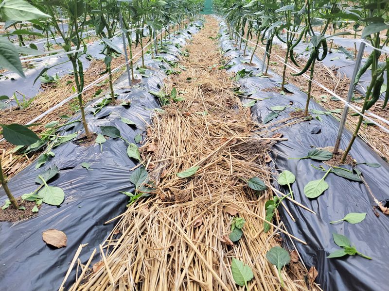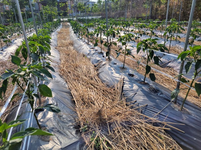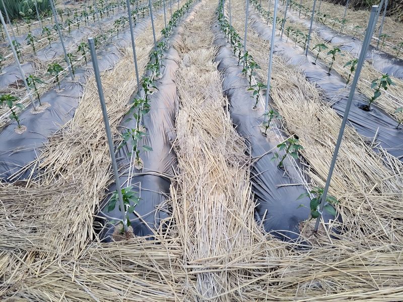 오늘밤 새벽녁에 서리가 피해가 있을예정 청양고추 오이 토마도 비닐멀칭 했어요 1)오이 7포기 정식작업 이랑에 볏짚 깔아주기