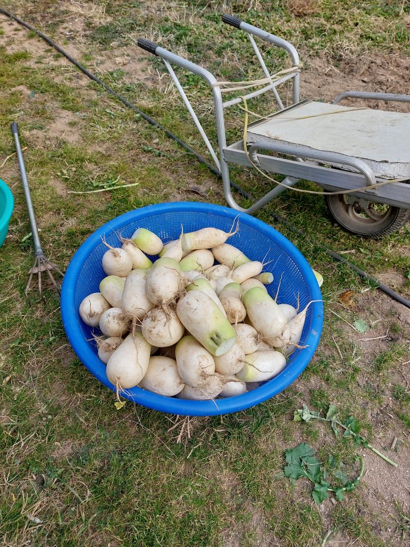 무우 수확(종이박스에 신문지 감싸 보관), 표무권 무우4개 지급