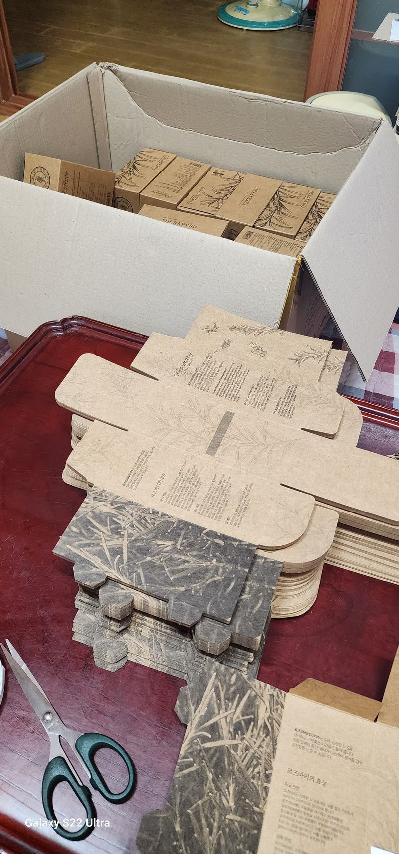 박스 만들고 라벨 붙이기. 병입 까지만 공장에서 하고, 박스 접기는 수작업으로 겨우 1,000개만 생산 하니 가능한 일.