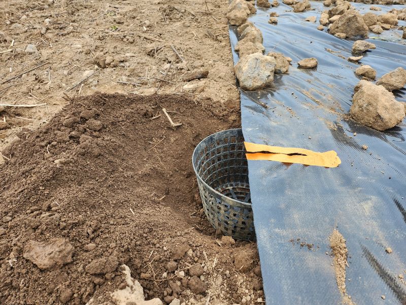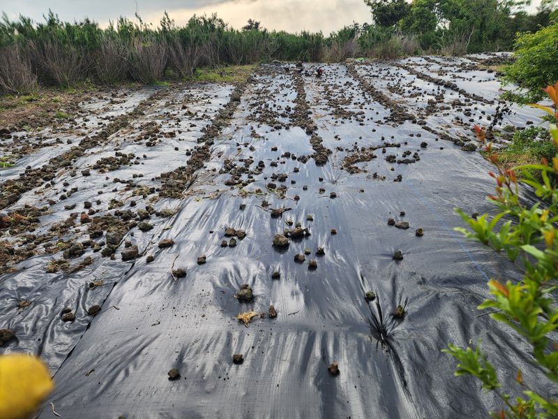 망분에 로즈마리 심기 2천평. 하나 파고 . 테이프 붙이는 이유는 한솔매트. 올. 풀리면 짜중 나니까. 깔끔하게. 예술 작품하기로. 두어달 걸 리려나? 동시에 두군데 작업이라. 벅차긴 해도 심기일전 합니다.