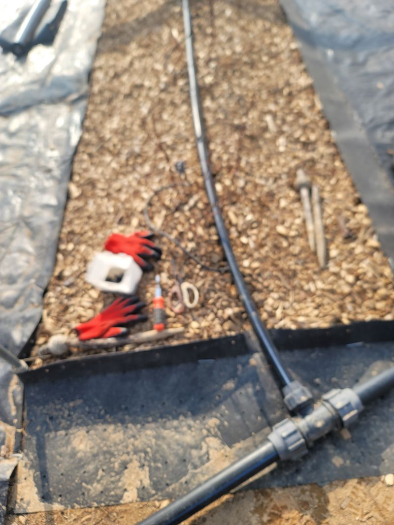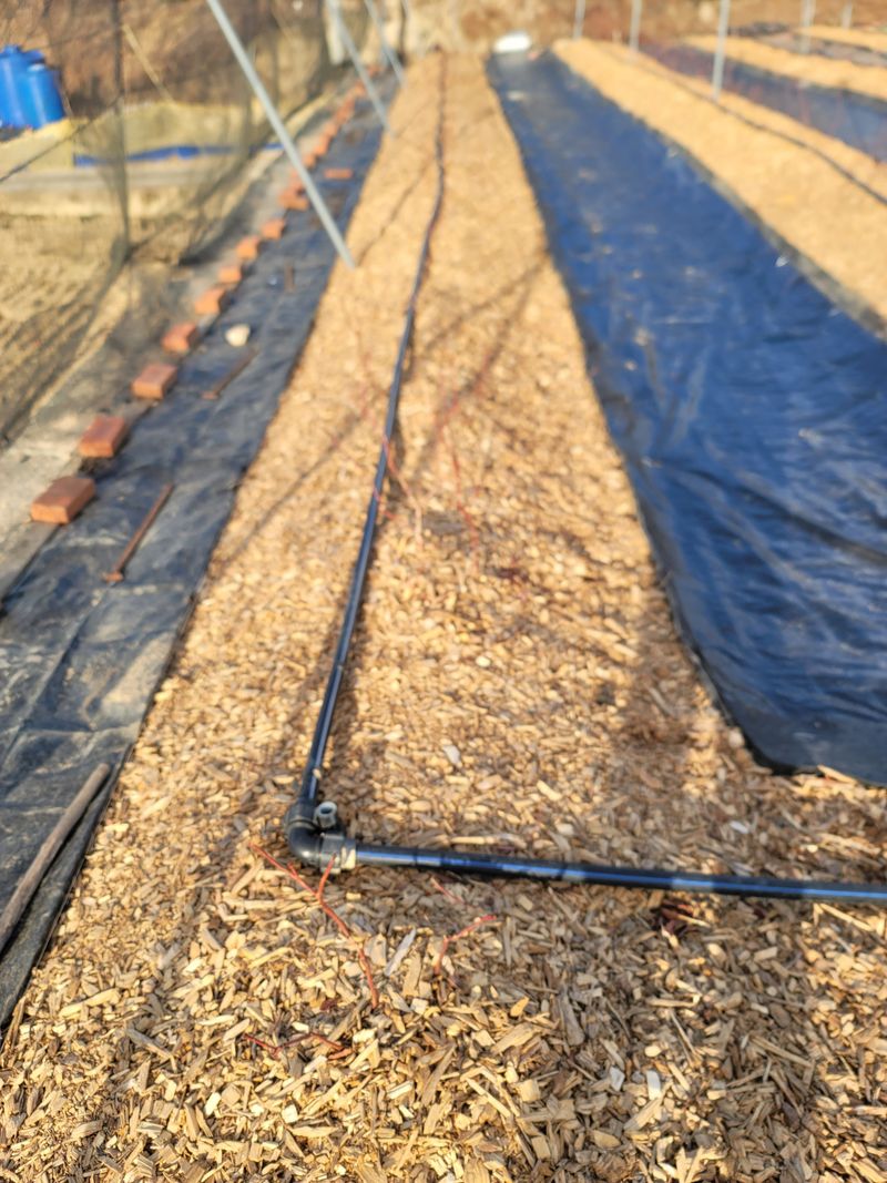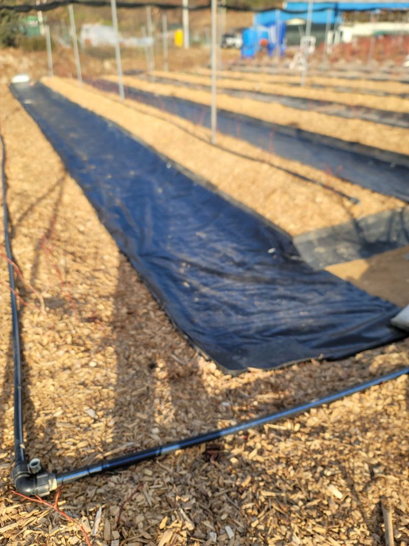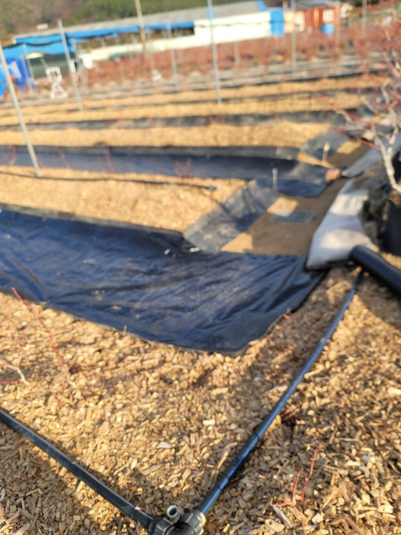 1. 제초매트작업 2. 저수지 물 5톤 물통에 입수작업 배관을 완성하고 양액 등 비료 공급을 주로하는 물통에 물을 80% 체우고 수문을 닫았다.