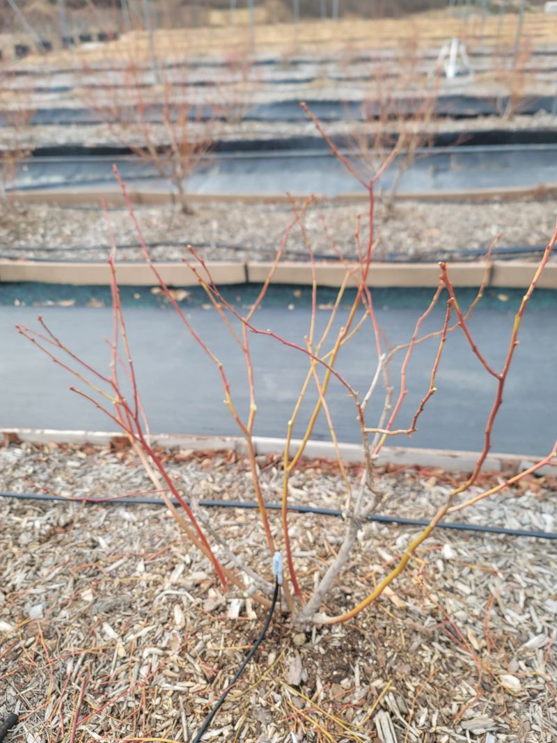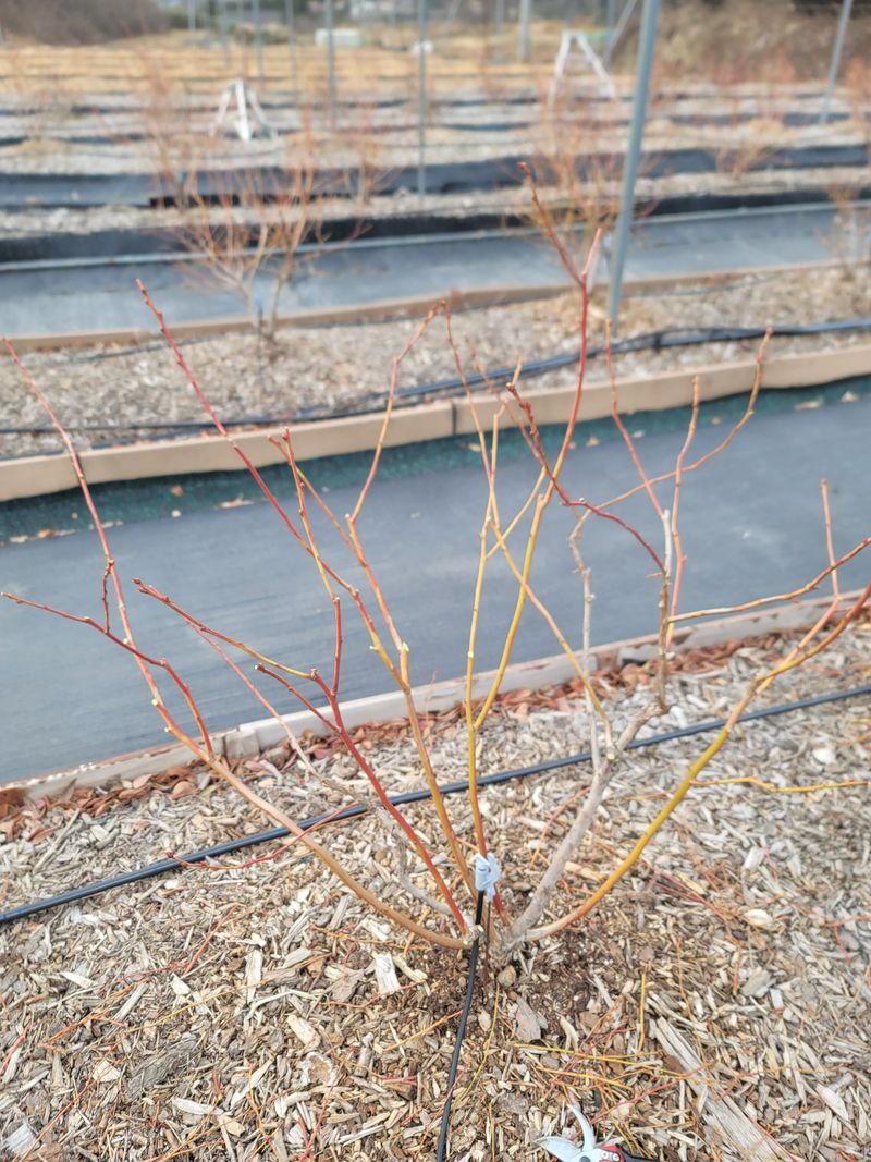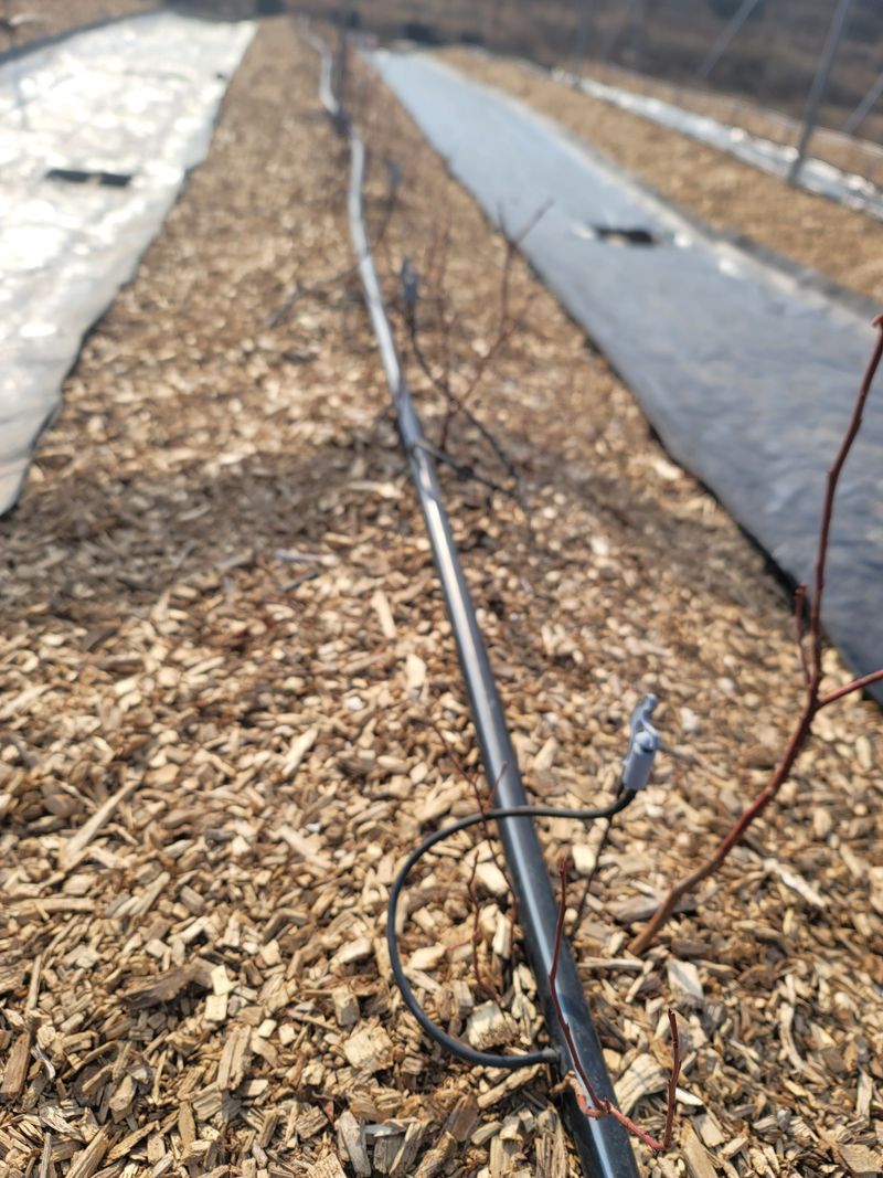 블루베리 토경 노지 정식 폭1500mm에 고랑1500mm 높이10cm의 이랑과 뚝을 토성 개량용으로 유황과 게르마늄을 넣어 경운한 다음 마늘밭처럼 만들고, 줄간 3m 주간 1.2m 간격으로 식재했다.