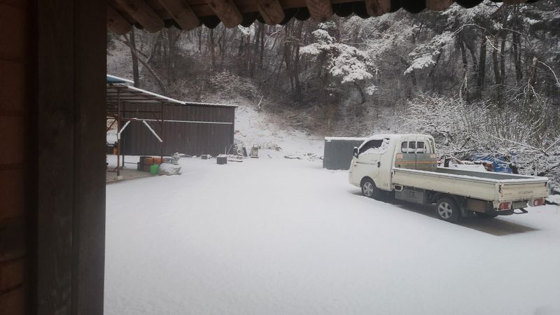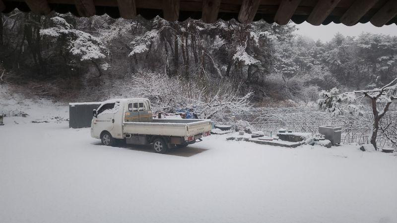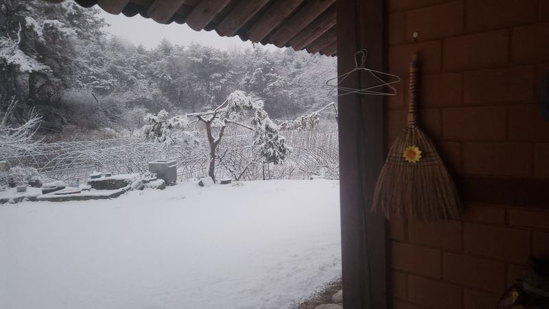 대설주의보가 발효되고 밤새 눈이 많이 내렸네요 눈이 쌓여 도로상황도 불편하고 오늘은 쉬라는 뜻이네요 자두나무 가지치는 작업은 중지하고 잠시 휴식하라는 것 같아요 농사는 눈이나 비가오고 또는 기상악화시에는 농민에게는 휴식시간 입니다