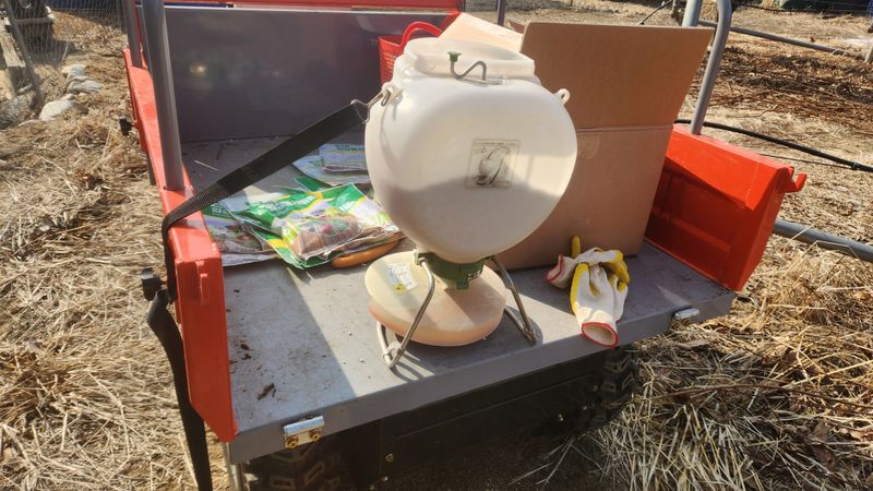 가지치기작업과 동시에 입사 붕사비료를 살포하였읍니다 붕사비료는 1kg짜리 12포를 살포기로 골고루 뿌려 주었습니다 1kg 한포로 200평을 뿌려 주려면 손으로 작업하면 제대로 골고루 뿌려주기가 힘들고 어려운 난제 이지요 그래서 살포기를 구입해서 뿌려보니 정말로 거의...