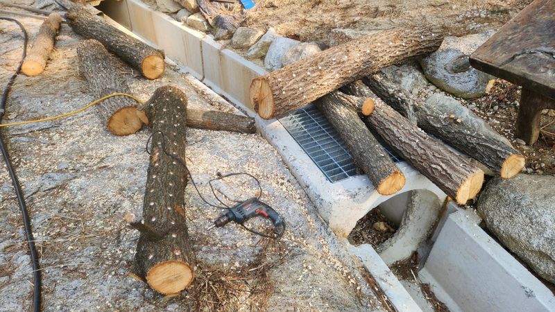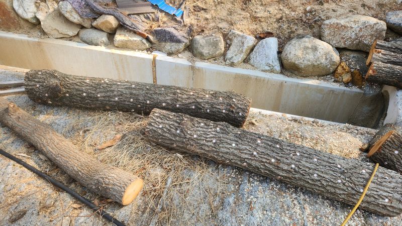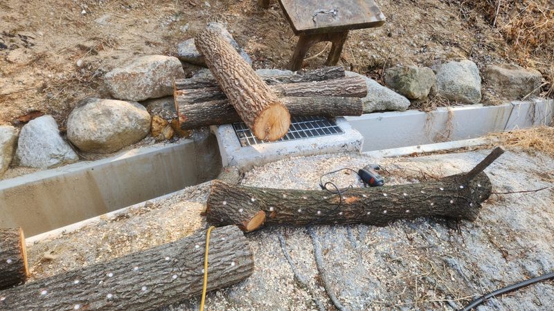 표고 버섯 종균을 넣었습니다 작년 가을에 베어놓은 참나무와 밤나무에 구멍을 뚨어서 종균을 접종 했습니다 나무 직경20cm~25cm 정도 크기에 길이 120cm의 나무 몇개만 하면 식구가 먹기에는 충분한 량이 되는 것 같습니다 생표고는 따서 얇게 썰어서 참기름소금장에 ...