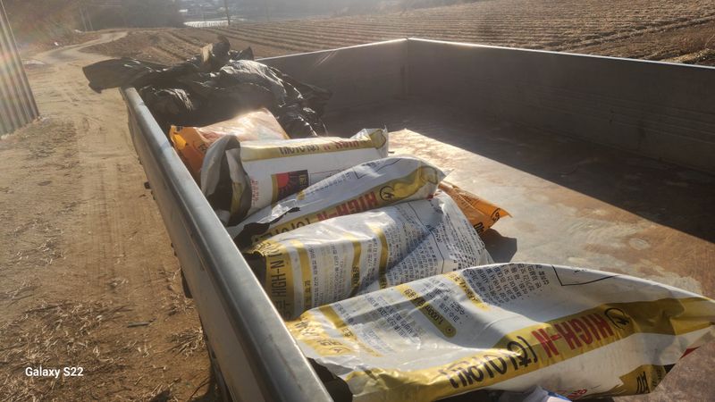 자두나무 가지치기작업을 끝내고 비료를 살포 하였습니다 용성 인비와 유황칼슘 그리고 유박을 자두밭에 골고루 살포 하였습니다