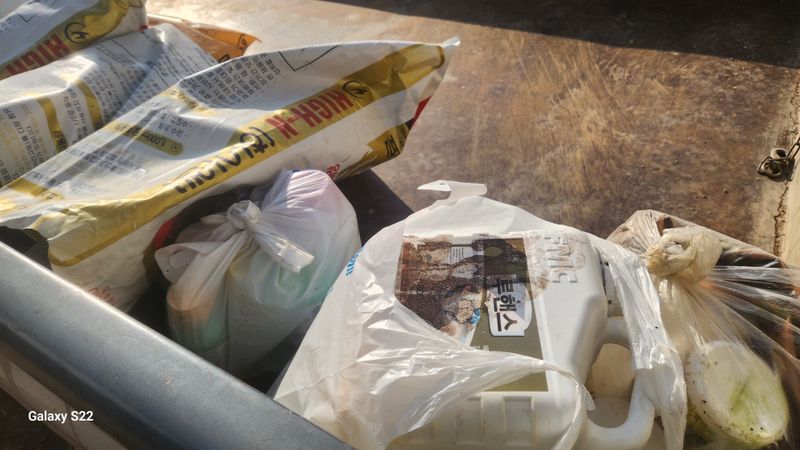자두나무 물을 주었습니다 10톤탱크에 물을 넣고 관주를 하였습니다 그리고 텃밭에 씌운 비닐을 제거하고 비료포대를 모두 정리하여 폐기물 했습니다