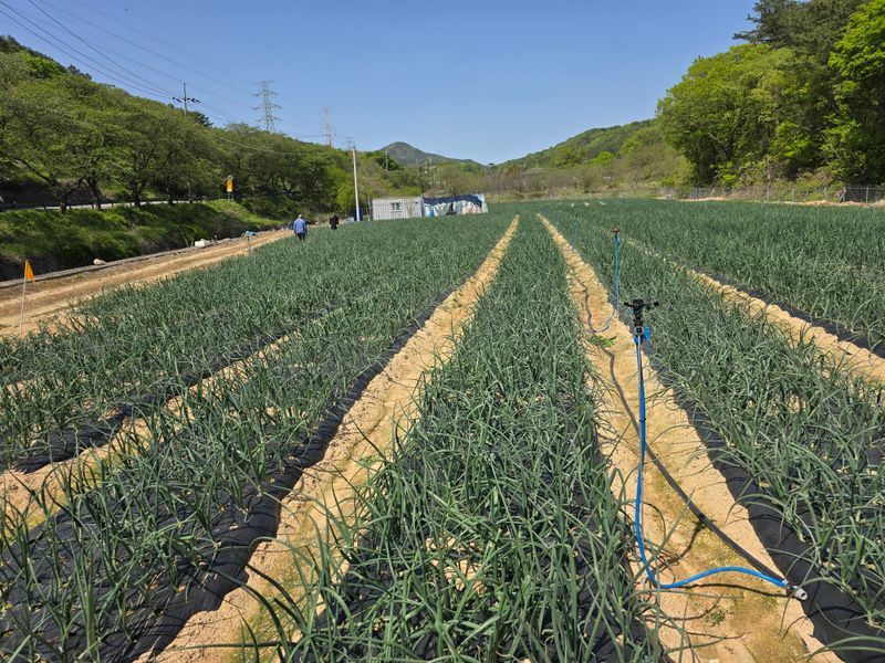 양파 밭 스프링쿨러 돌려줌 양파 모종 잘록병약줌
