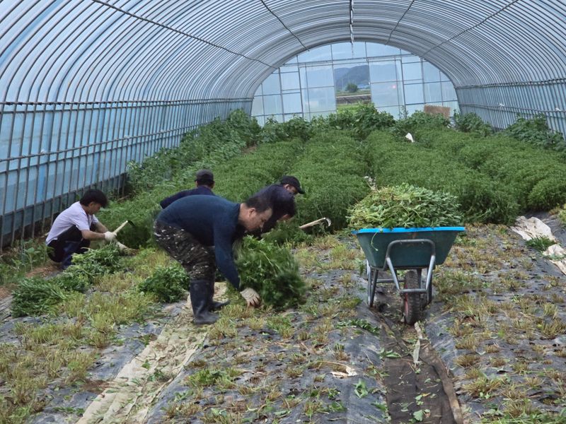 북면 아주머니 6분 생강 다듬음 저녁에 외국인 4명 와서 생강 뽑고 생강 줄기치움