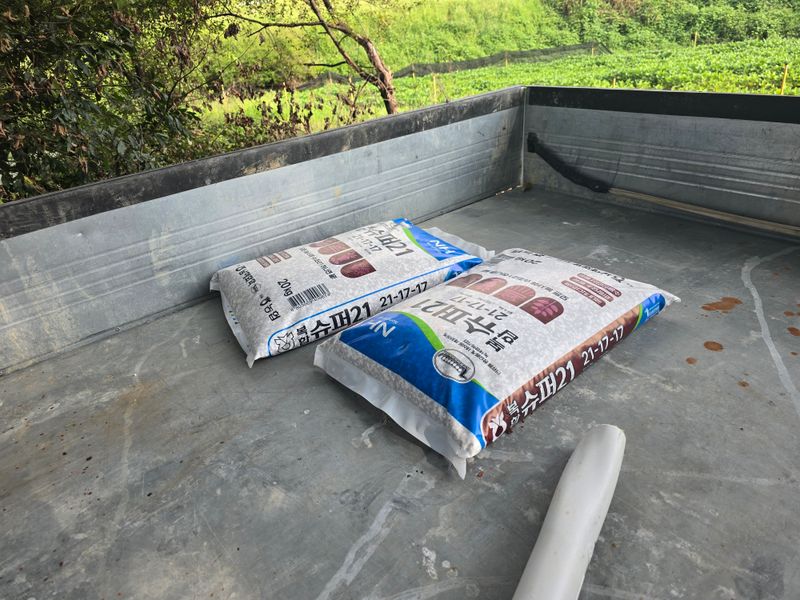 마늘 심을데 복합비료 3포 가축분퇴비 15포 뿌려줌