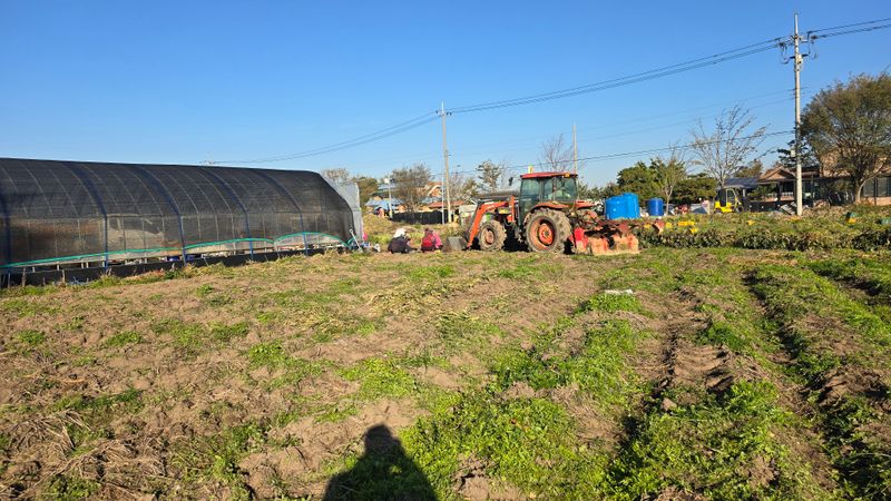 생강 작업 북면 아주머니 6명오후에2명작업 외국인 오후에 와서 생강 줄기치우고 비료 황산칼슘40포 복합비료 40포 트랙터 에 부어주고 생강 씻음 낙수동 볏집6개