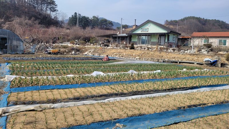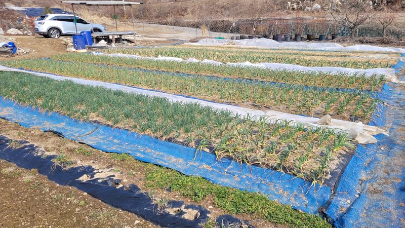 모처럼 햇님도 빤짝 비가온후 잠깐 시간내어 마늘밭 잡초제거및 웃거름 살포했어요.# 다행히 끝나고 비가 더와서 관수도 되고.. 부직포속 마늘들은 잘자라고 있습니다.#