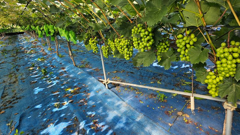 ㅡ. 11시도착 35도 넘더음 포도 5시간 관주 비린내와 nk .붕산비료 물에녹여 관주함 ㅡ. 2차 알정리 2열까지함