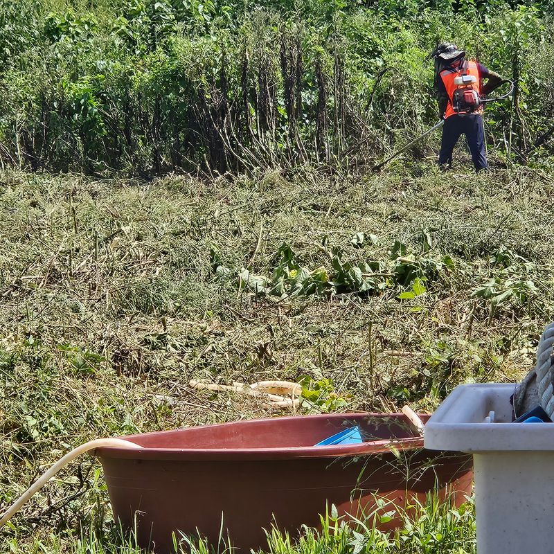 사람사서 백합밭의 잡초를 예초기로 제거하고 있어요