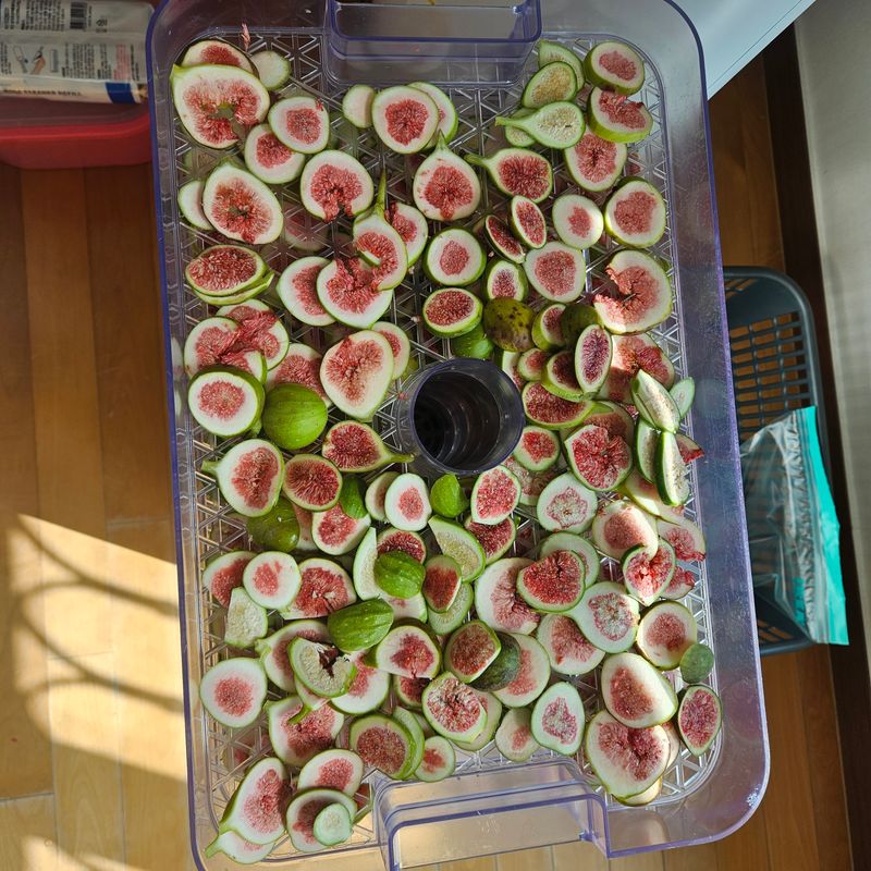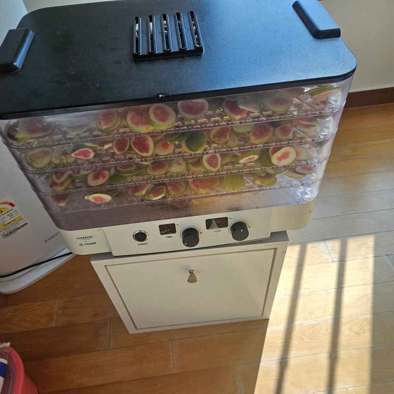 서리가 내려 무화과 잎들이 모두 냉해를 입어 시들해졌다. 익지 않은 무화과를 모두 따서 얇게 썰어 건조기에서 말린다. 무화과 차를 기다리며