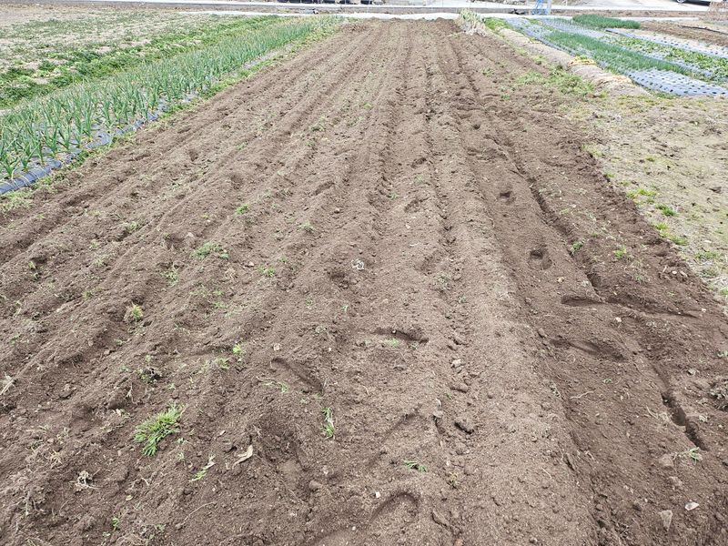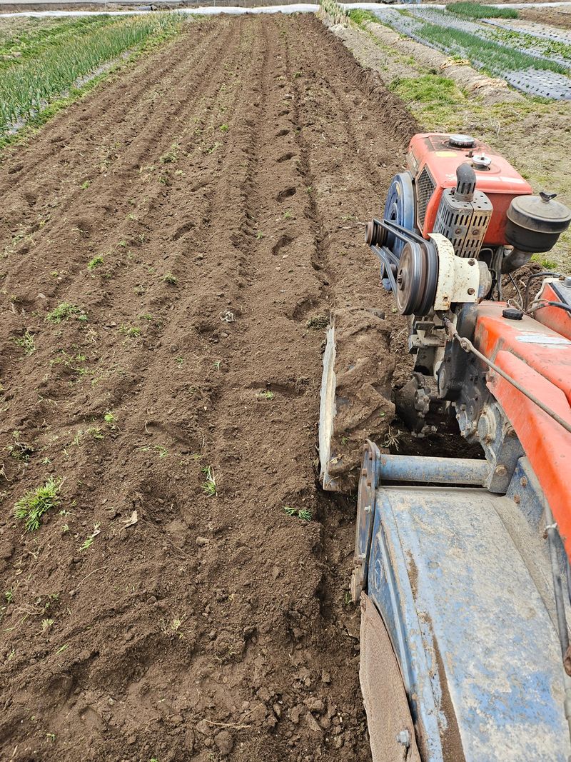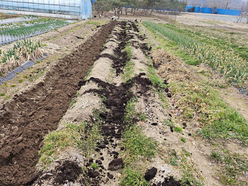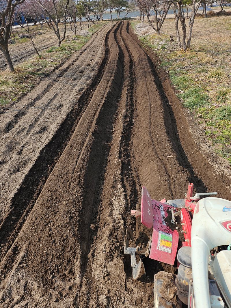 탚 원예 비료 살포 후 로터리 치고 일추일 후 관리기료 휴립 작업 후 감자 심고 멀칭 비닐 0.02mm 배색 비닐 씨우기. 완료