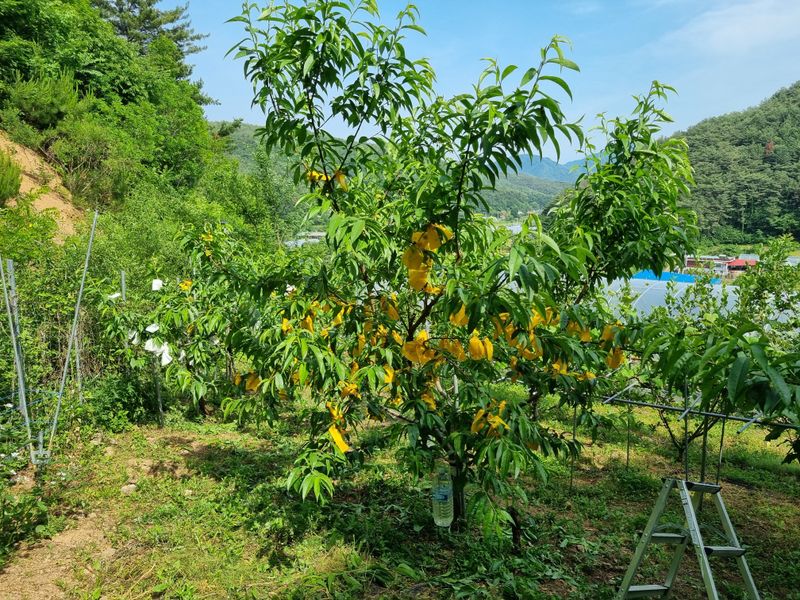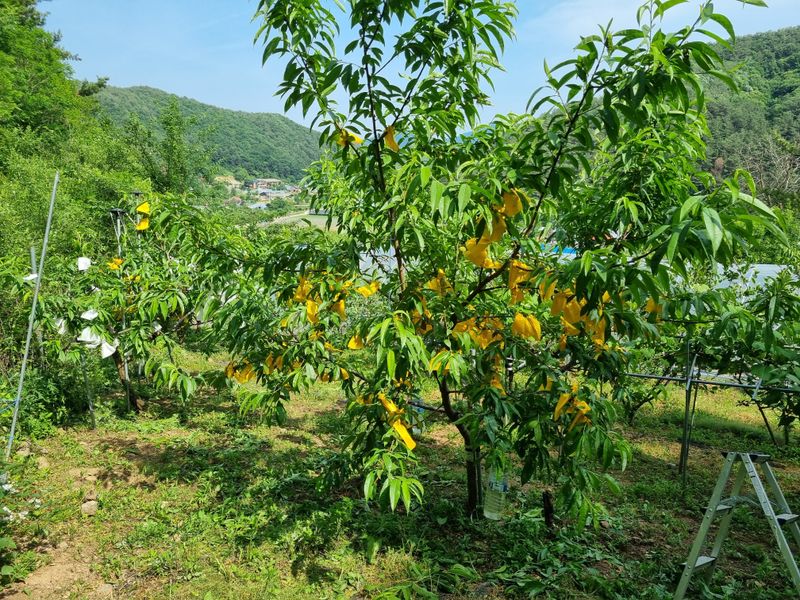 복숭아 봉지씌우기 (살균,살충제,진드기약 살포후실시) 지주대 설치