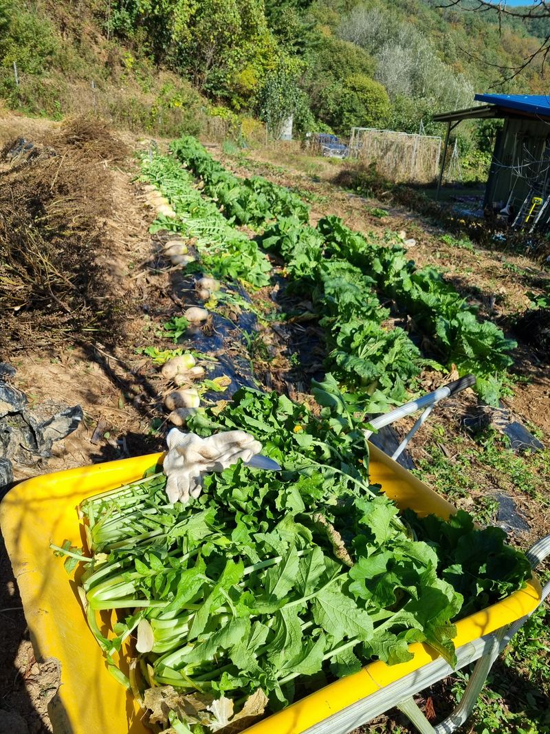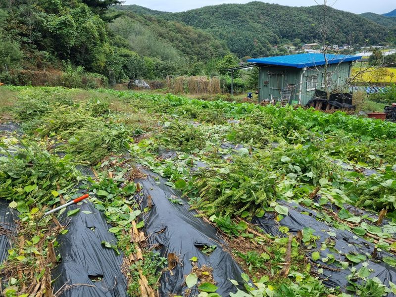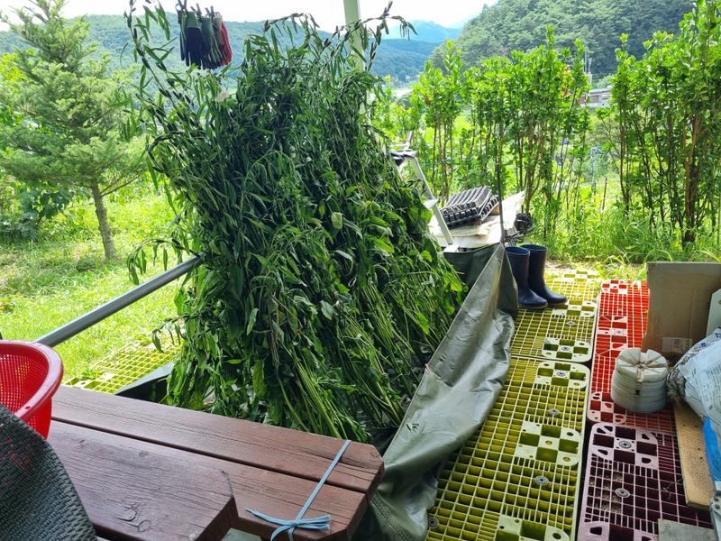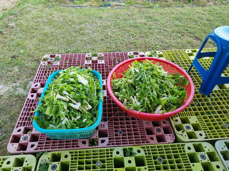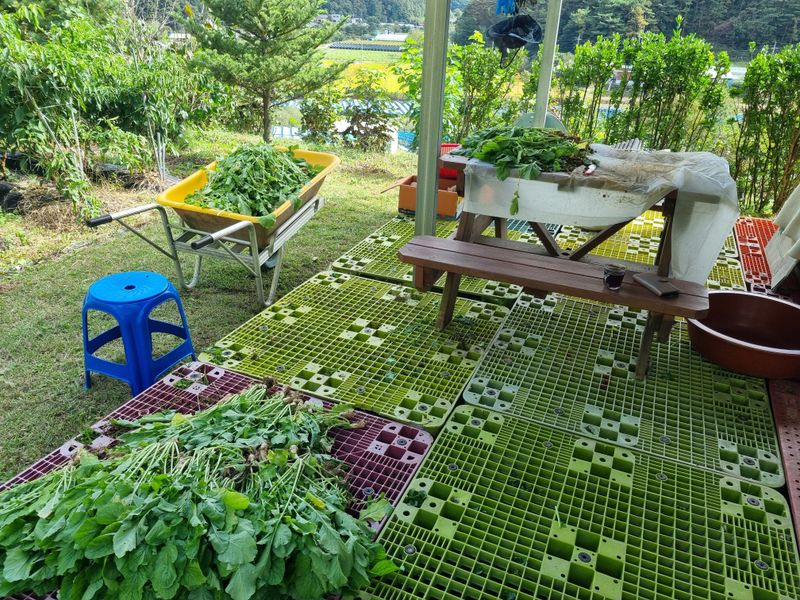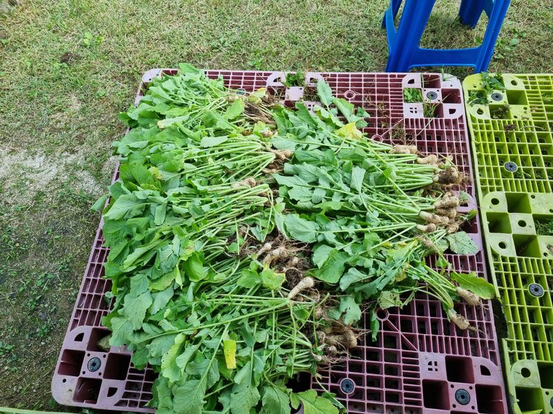 총각무 수확하기 너무베서 무크기가 좀적음 쏚기를 더해야겠음 파종47일 경과 무상태는 양호항