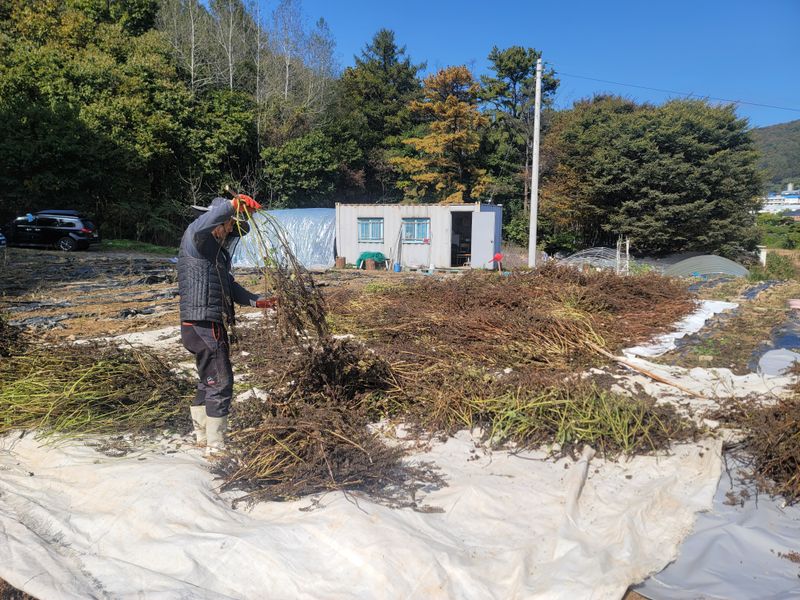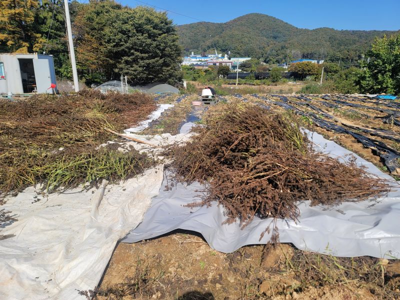 오늘은 새벽에일어나서 들깨수확ㆍ 한날. 잘베어서 내일모래 비가 온다고 해서 비닐 로 잘덮어놓았다