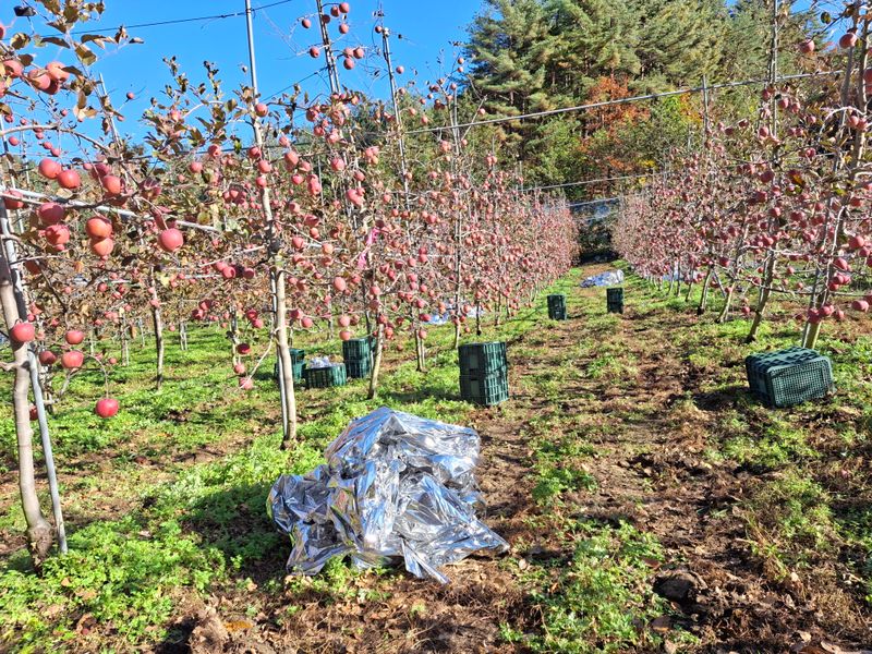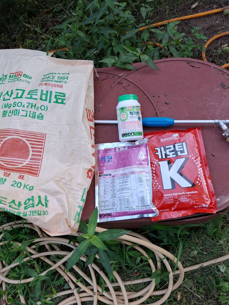 부사 겹무늬 감염사과 따내기 1상자 정도따냈다. 저녁때 홍로 윗밭과 부사밭에만 올해 마지막 약을 쳤다.