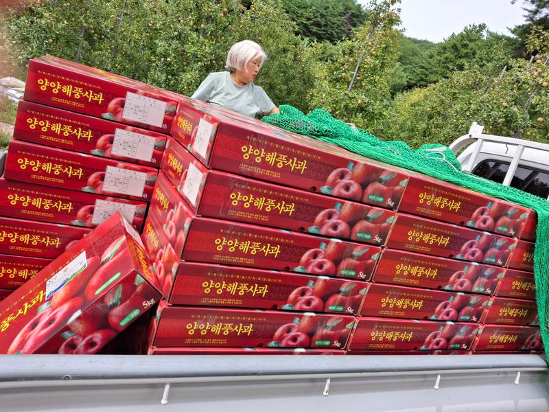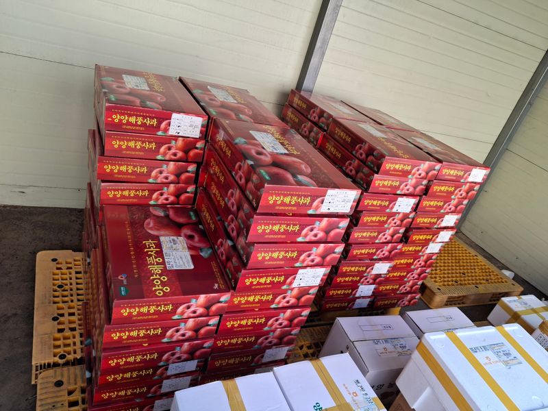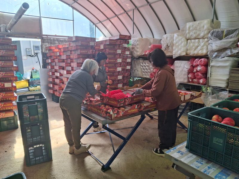 하조대 농협에 사과 145 박스납품 했다. 오후에는 명지리 사과 수확 4상자