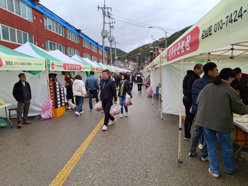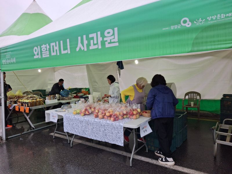 오늘 송이축제 사과 판매를 했다. 가늘은비가 계속 내렸으나 꾸준하게관람객은 방문 했다. 25상자가 출고됬다.