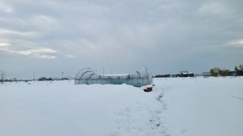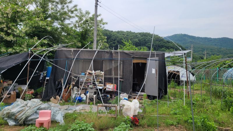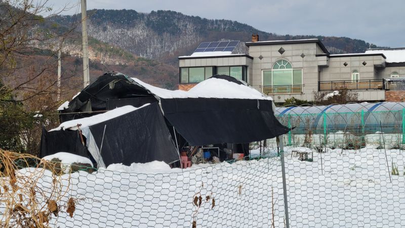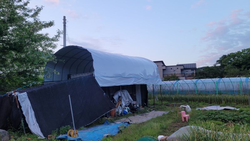 폭설에 주저앉았던 하우스 철거 후 보수 2일에 걸쳐 비닐이 아닌 코팅된 차광필림으로, 수명이 더 길고, 눈이 쌓이지 않고 잘 미끄러 진다고 해서 변경해봤습니다