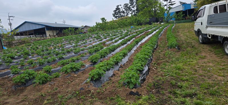 감자 고랑 제초작업을 하고 추비하였습니다. 두둑을 높게하고 흙붇돋우기,관수, 추비만 잘하면 감자는 잘 달립니다.