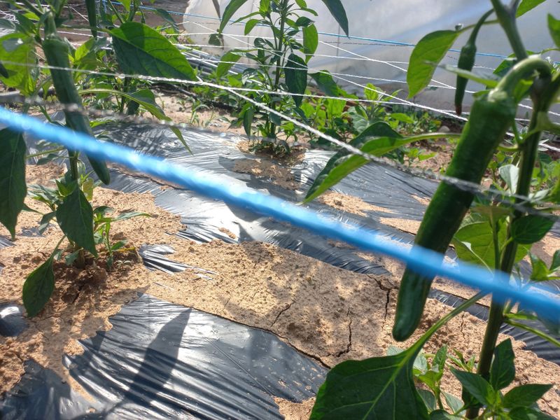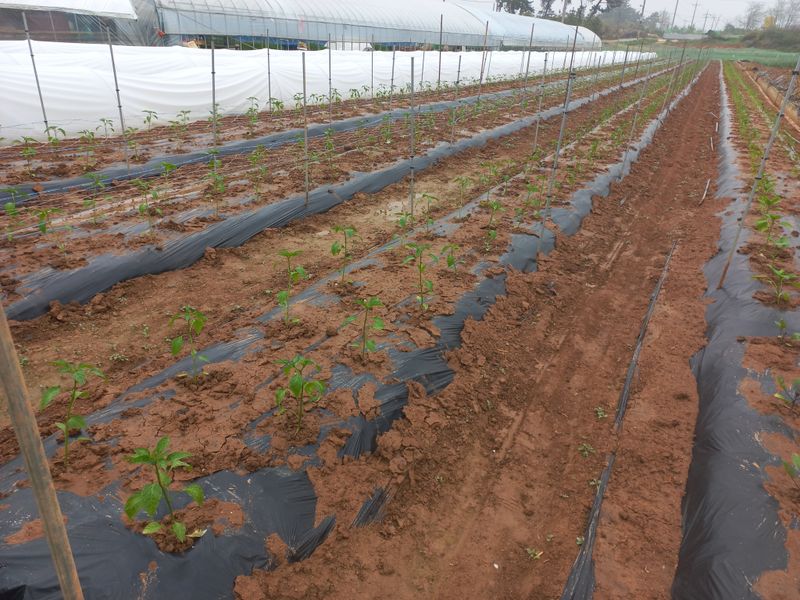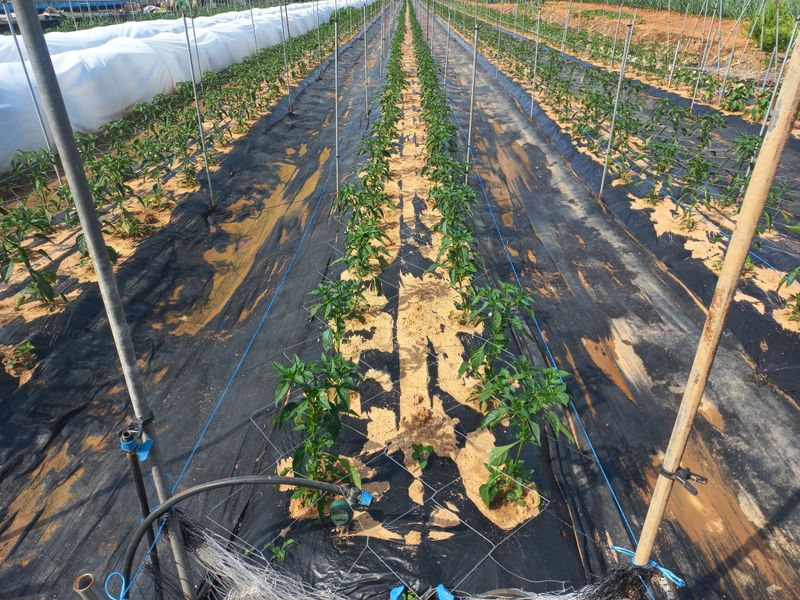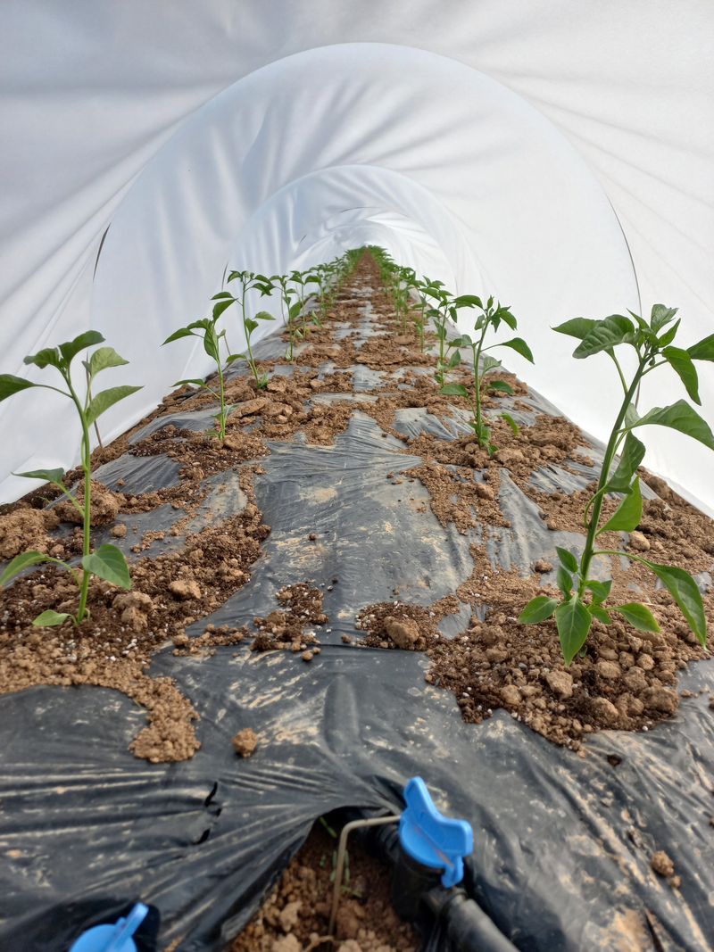 4월2일에 터널재배용 고추정식했습니다. 세두둑 1,000주만 먼저 심었고, 그옆으로 나머지 1,200주는 5월5일쯤 정식예정입니다. 모종간격50cm 줄간격40cm 점적은10cm 두줄넣었구요. 부직포는 40g, 폭2.4M입니다. 해놓고보니 골간격80cm가 작은듯 합니다...