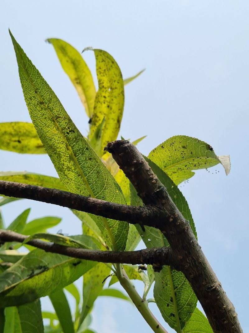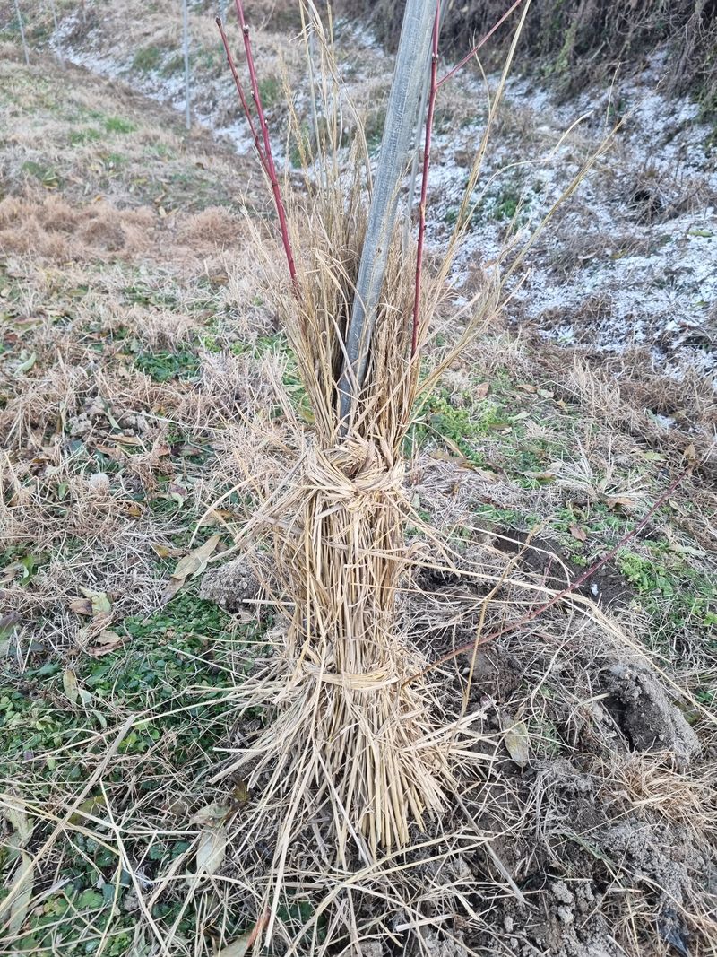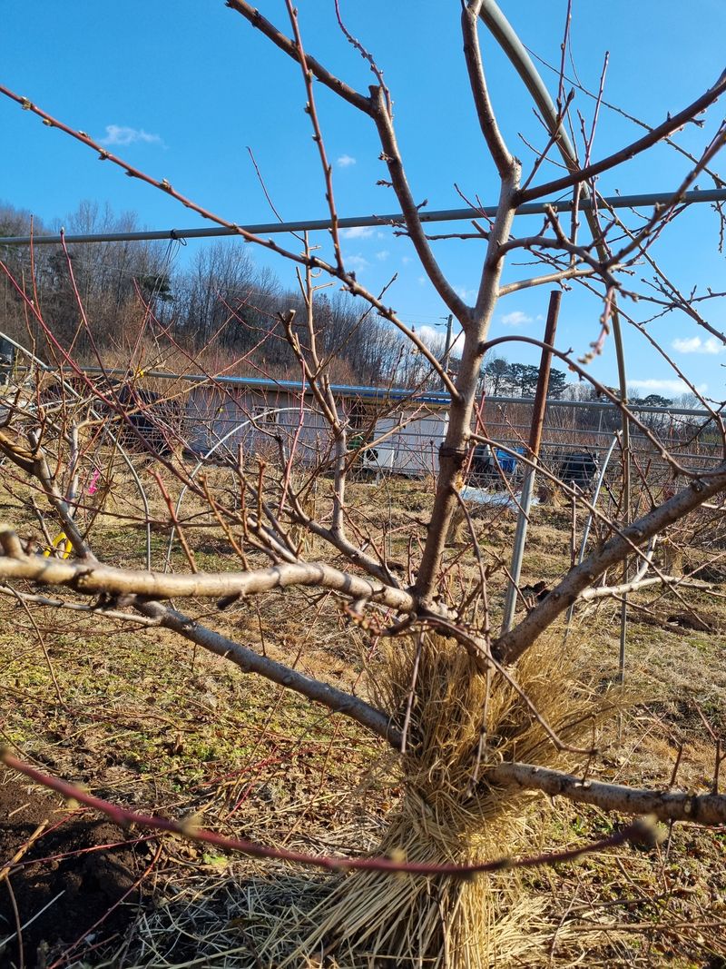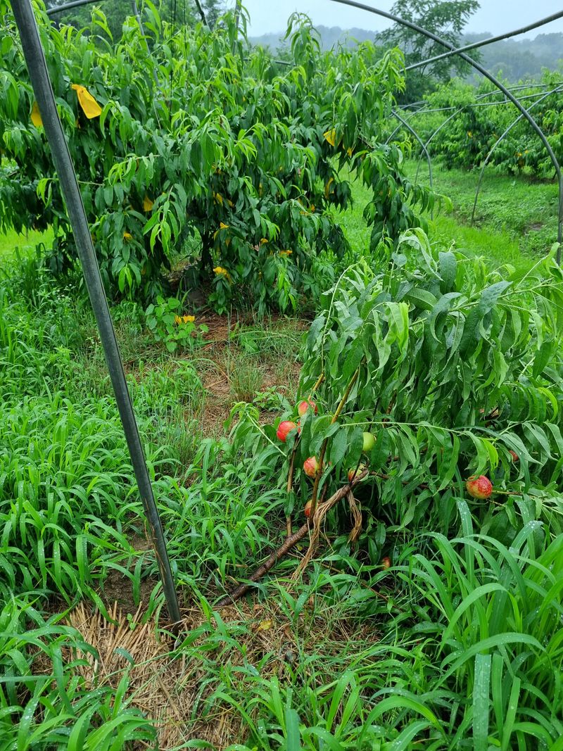 신비복숭아를 2년차 3년차가 있는데 비가 많이와서 잎이 많이붙어있고 물많이먹으니 무거워서 그런지 짚으로묶어놓은게 끈어졌다. 양말 끈두개연해서 다시 전부고정시켜주었 습니다. 잘살수있겠죠