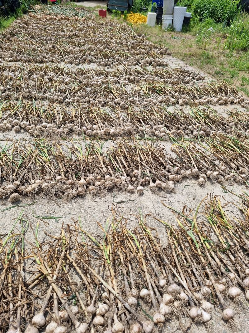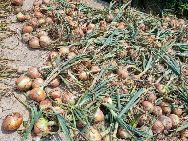 마늘.양파 큐얼링작업 진행중 내일 비온데서 걱정 됩니다. 장마통에 썩일 우려있어 양파도 캣어요 근데 양파가 1kg 넘는게 나오네요