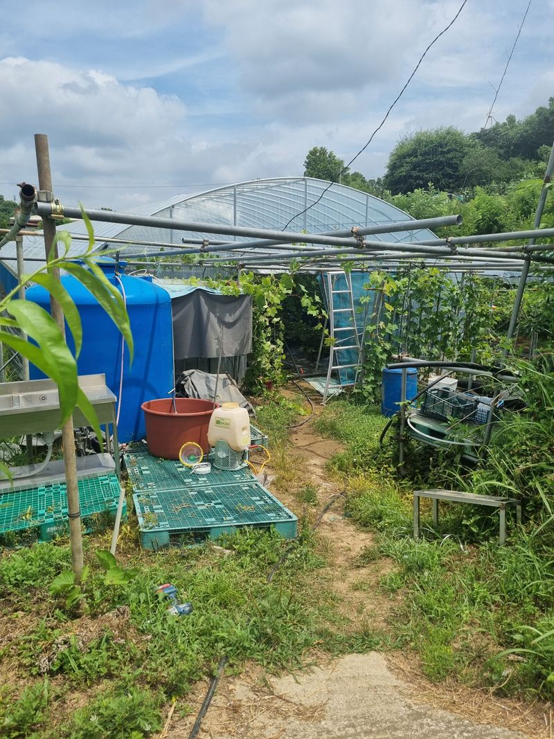 콩에 풀약3일차하고 포도물주기하고 근데 포도에등한시했나 축과증상이 보이네요 일소 피해도 있고 하우스온도개폐기 야쪽문 다열어놨는데도47.7도시나 올라갔네요 아~ 어떻게 하지?