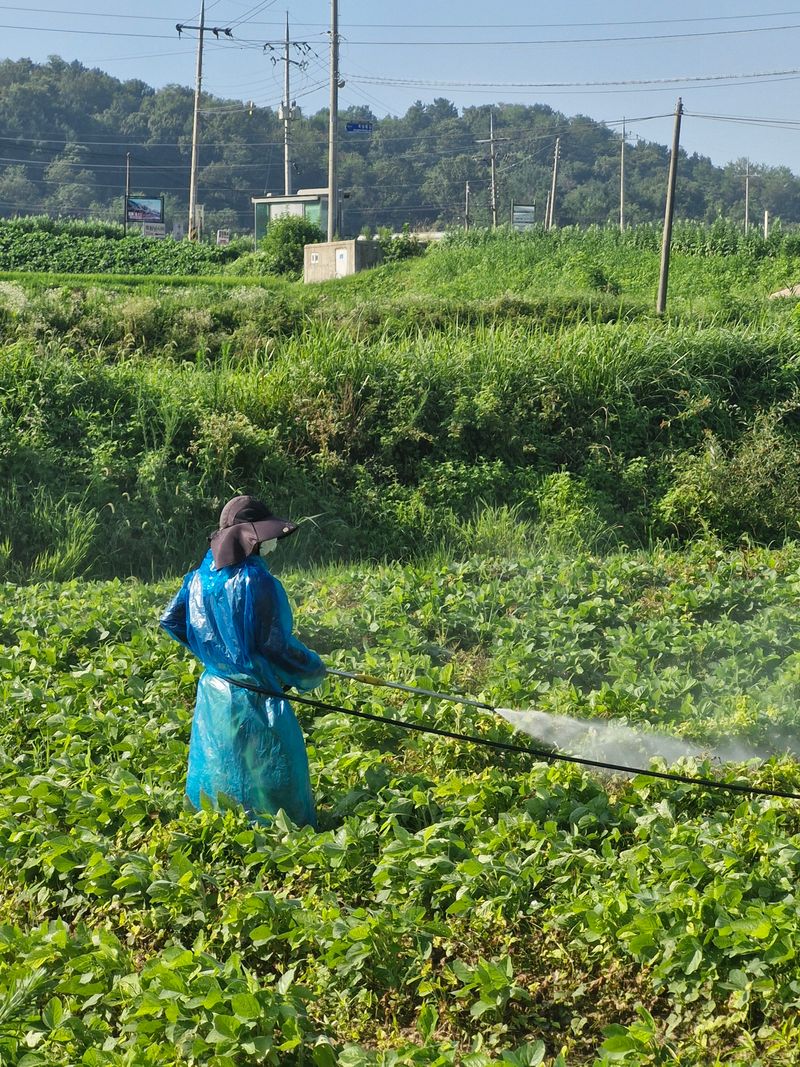 라쏘 콩 경작지에 살포 손으로 고추약하고 고추. 고구마 골에 바스타 살포 꼭지 가이드 달린것으로