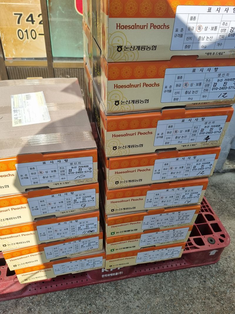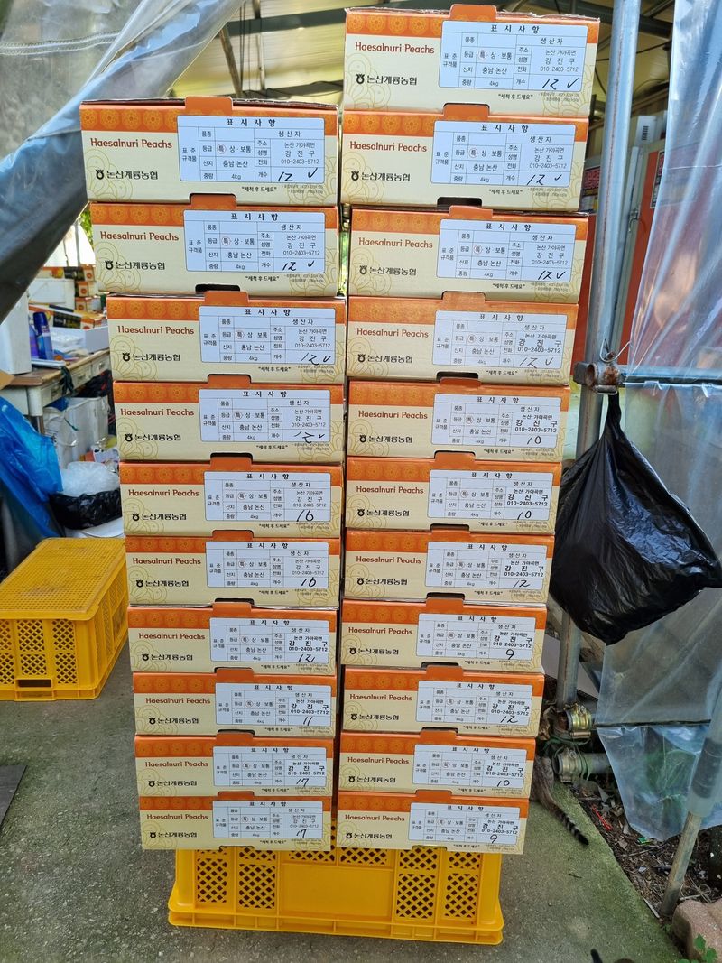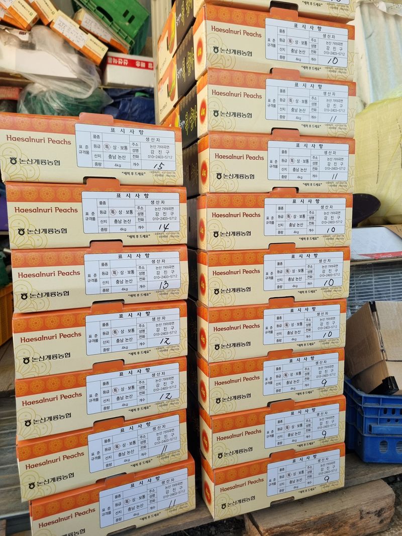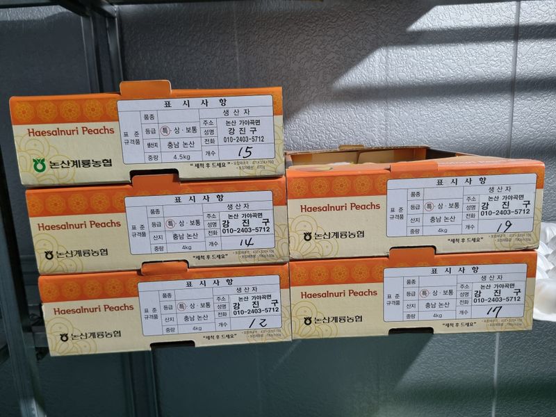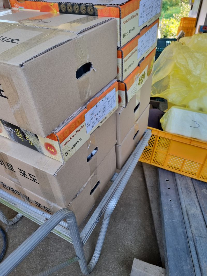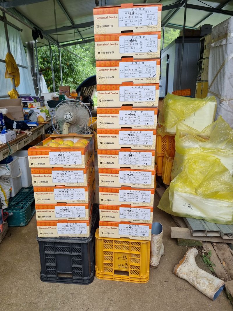 복숭아포장 비가왔지만전날 따서저온창고들어감 포장지 바꾸어봤음 비용 8배 소요