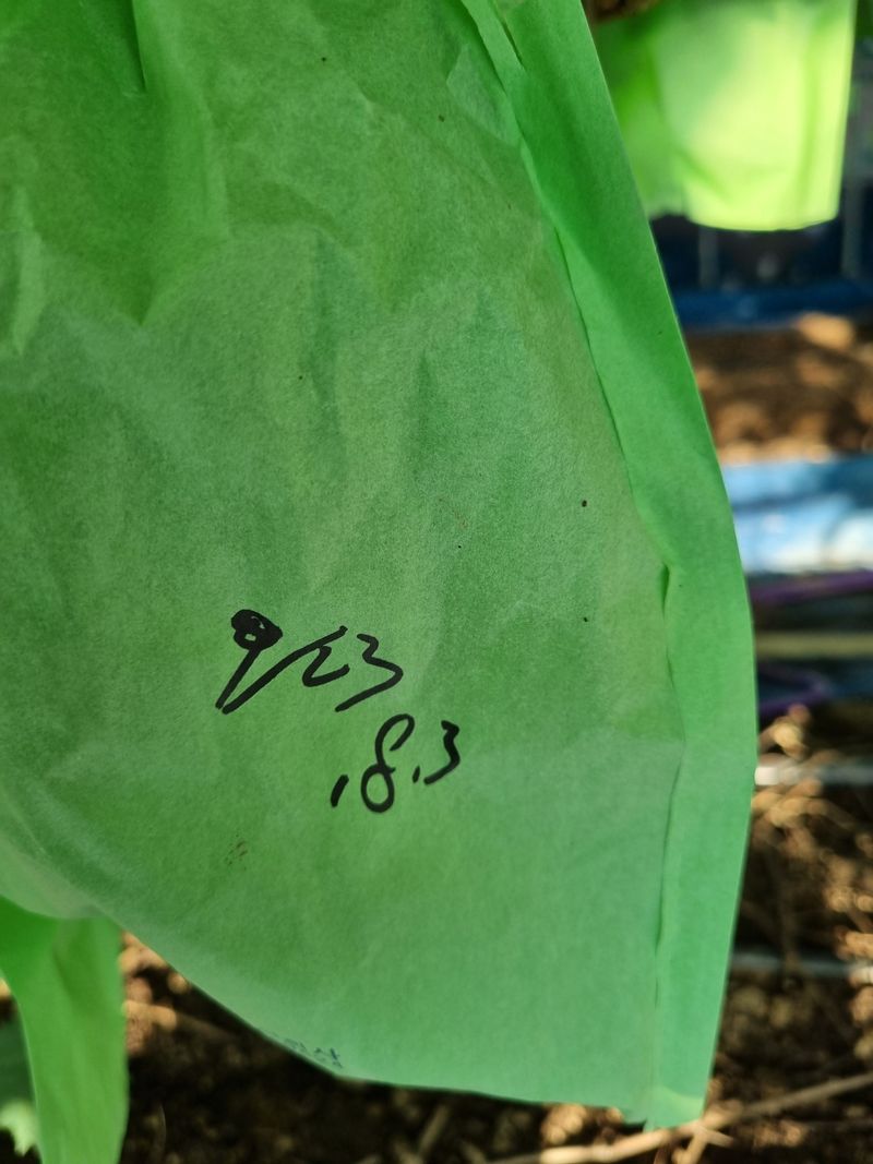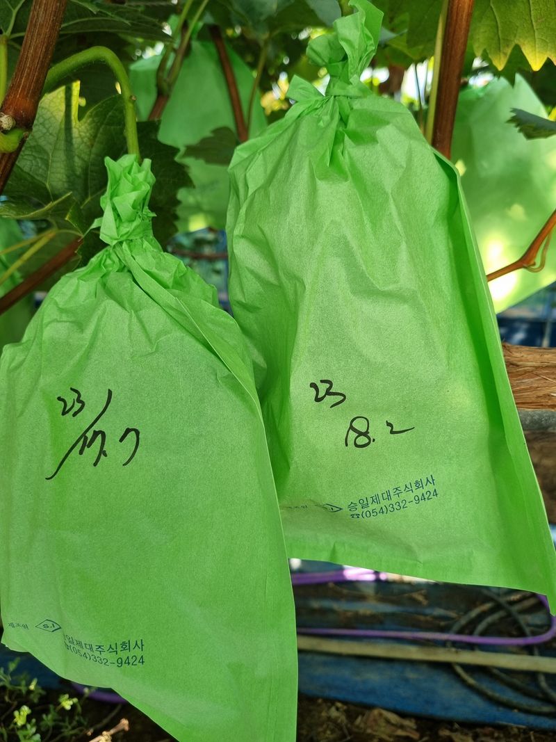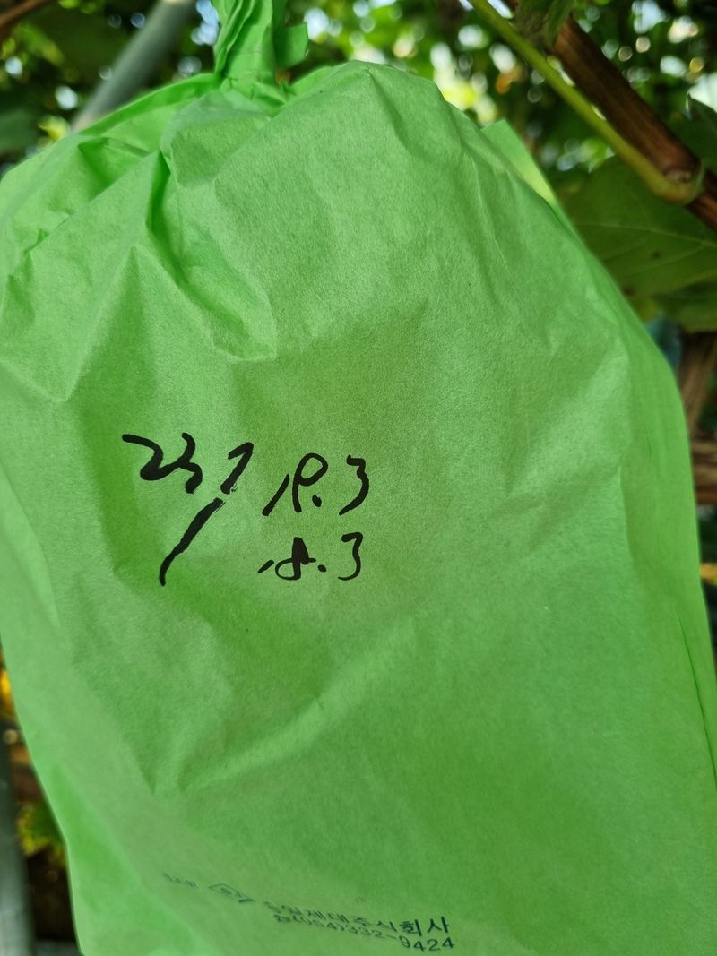 봉지쌓기3일째 용병세분 모셔다 가르켜가며 쌓네요 근데열매솎기 4일된는데 노린제가 자기거라고 표시하고 디니네요